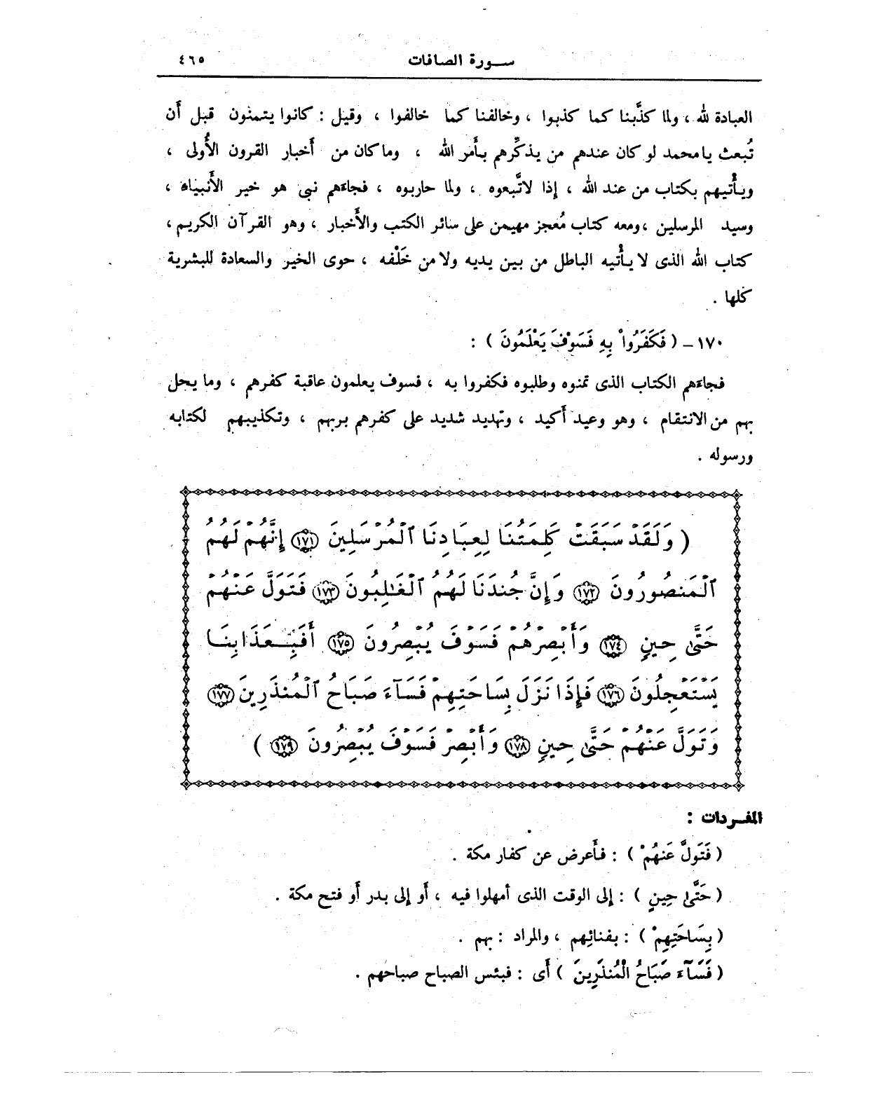 {وَلَقَدْ سَبَقَتْ كَلِمَتُنَا لِعِبَادِنَا الْمُرْسَلِينَ (171) إِنَّهُمْ لَهُمُ الْمَنْصُورُونَ (172) وَإِنَّ جُنْدَنَا لَهُمُ الْغَالِبُونَ (173) فَتَوَلَّ عَنْهُمْ حَتَّى حِينٍ (174) وَأَبْصِرْهُمْ فَسَوْفَ يُبْصِرُونَ (175) أَفَبِعَذَابِنَا يَسْتَعْجِلُونَ (176) فَإِذَا نَزَلَ بِسَاحَتِهِمْ فَسَاءَ صَبَاحُ الْمُنْذَرِينَ (177) وَتَوَلَّ عَنْهُمْ حَتَّى حِينٍ (178) وَأَبْصِرْ فَسَوْفَ يُبْصِرُونَ (179)}