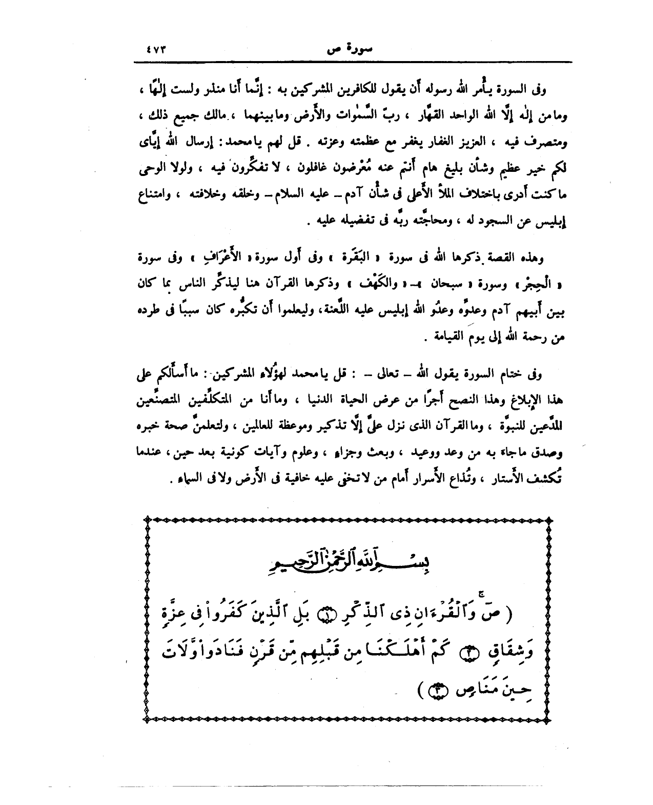 {ص وَالْقُرْآنِ ذِي الذِّكْرِ (1) بَلِ الَّذِينَ كَفَرُوا فِي عِزَّةٍ وَشِقَاقٍ (2) كَمْ أَهْلَكْنَا مِنْ قَبْلِهِمْ مِنْ قَرْنٍ فَنَادَوْا وَلَاتَ حِينَ مَنَاصٍ (3)