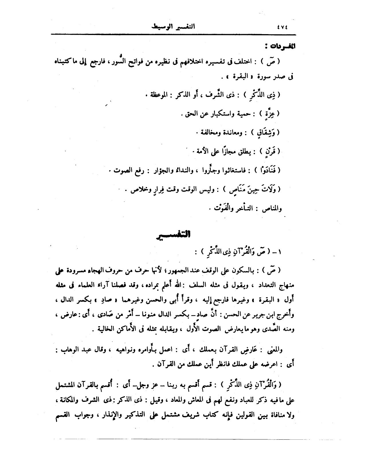 {وَالْقُرْآنِ ذِي الذِّكْر}: قسم أَقسم به ربنا - عز وجل - أَي: أُقسم بالقرآن المشتمل على ما فيه ذكر للعباد ونفع لهم في المعاش والمعاد، وقيل: ذي الذكر: ذي الشرف والمكانة، ولا منافاة بين القولين فإنه كتاب شريف مشتمل على التذكير والإنذار، وجواب القسم