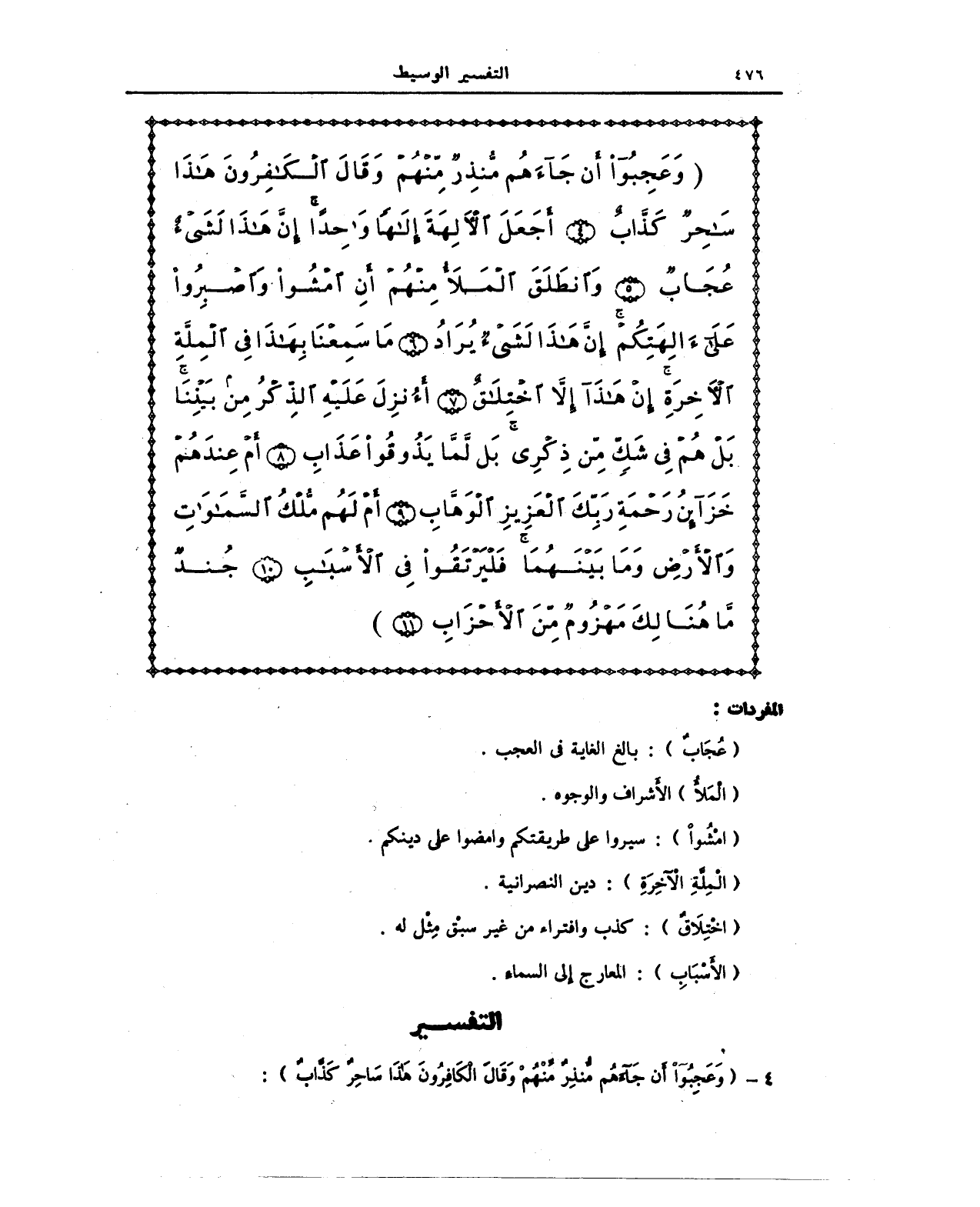 {وَعَجِبُوا أَنْ جَاءَهُمْ مُنْذِرٌ مِنْهُمْ وَقَالَ الْكَافِرُونَ هَذَا سَاحِرٌ كَذَّابٌ (4) أَجَعَلَ الْآلِهَةَ إِلَهًا وَاحِدًا إِنَّ هَذَا لَشَيْءٌ عُجَابٌ (5) وَانْطَلَقَ الْمَلَأُ مِنْهُمْ أَنِ امْشُوا وَاصْبِرُوا عَلَى آلِهَتِكُمْ إِنَّ هَذَا لَشَيْءٌ يُرَادُ (6) مَا سَمِعْنَا بِهَذَا فِي الْمِلَّةِ الْآخِرَةِ إِنْ هَذَا إِلَّا اخْتِلَاقٌ (7) أَأُنْزِلَ عَلَيْهِ الذِّكْرُ مِنْ بَيْنِنَا بَلْ هُمْ فِي شَكٍّ مِنْ ذِكْرِي بَلْ لَمَّا يَذُوقُوا عَذَابِ (8) أَمْ عِنْدَهُمْ خَزَائِنُ رَحْمَةِ رَبِّكَ الْعَزِيزِ الْوَهَّابِ (9) أَمْ لَهُمْ مُلْكُ السَّمَاوَاتِ وَالْأَرْضِ وَمَا بَيْنَهُمَا فَلْيَرْتَقُوا فِي الْأَسْبَابِ (10) جُنْدٌ مَا هُنَالِكَ مَهْزُومٌ مِنَ الْأَحْزَابِ (11)}