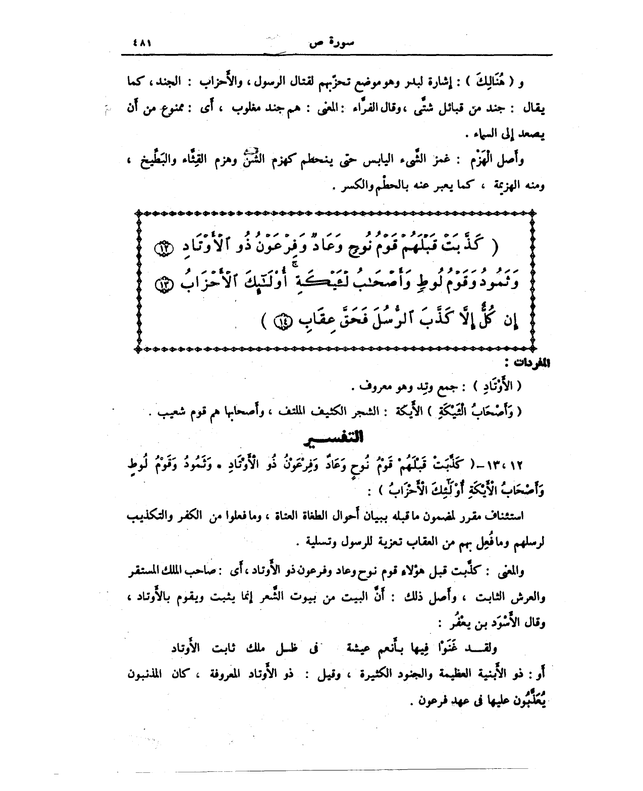 12، 13 - {كَذَّبَتْ قَبْلَهُمْ قَوْمُ نُوحٍ وَعَادٌ وَفِرْعَوْنُ ذُوالْأَوْتَادِ (12) وَثَمُودُ وَقَوْمُ لُوطٍ وَأَصْحَابُ الْأَيْكَةِ أُولَئِكَ الْأَحْزَابُ (13)}: