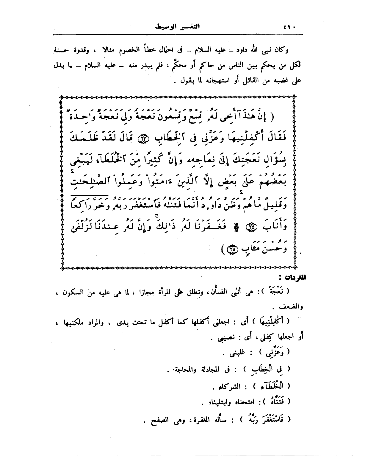 {إِنَّ هَذَا أَخِي لَهُ تِسْعٌ وَتِسْعُونَ نَعْجَةً وَلِيَ نَعْجَةٌ وَاحِدَةٌ فَقَالَ أَكْفِلْنِيهَا وَعَزَّنِي فِي الْخِطَابِ (23) قَالَ لَقَدْ ظَلَمَكَ بِسُؤَالِ نَعْجَتِكَ إِلَى نِعَاجِهِ وَإِنَّ كَثِيرًا مِنَ الْخُلَطَاءِ لَيَبْغِي بَعْضُهُمْ عَلَى بَعْضٍ إِلَّا الَّذِينَ آمَنُوا وَعَمِلُوا الصَّالِحَاتِ وَقَلِيلٌ مَا هُمْ وَظَنَّ دَاوُودُ أَنَّمَا فَتَنَّاهُ فَاسْتَغْفَرَ رَبَّهُ وَخَرَّ رَاكِعًا وَأَنَابَ (24) فَغَفَرْنَا لَهُ ذَلِكَ وَإِنَّ لَهُ عِنْدَنَا لَزُلْفَى وَحُسْنَ مَآبٍ}