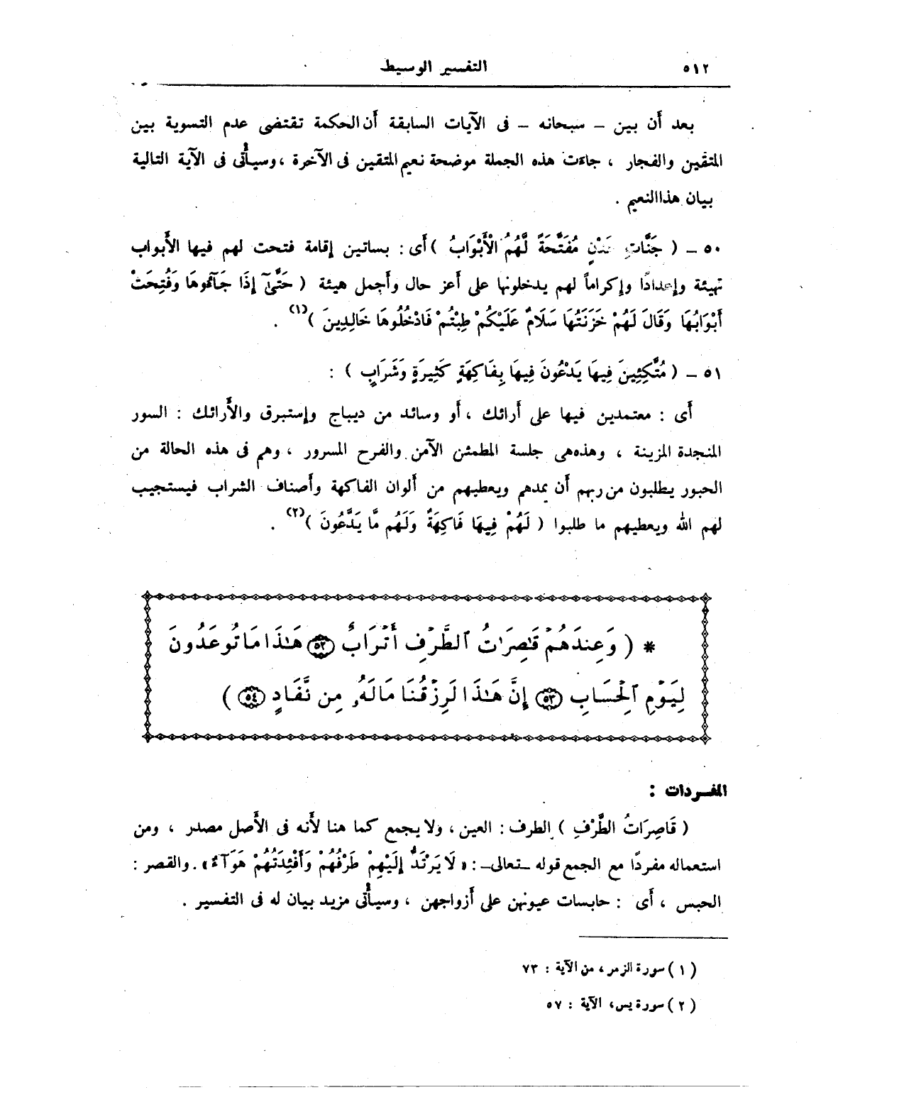 {قَاصِرَاتُ الطَّرْفِ} الطرف: العين، ولا يجمع كما هنا لأنه في الأصل مصدر، ومن استعماله مفردًا مع الجمع قوله - تعالى -: {لَا يَرْتَدُّ إِلَيْهِمْ طَرْفُهُمْ وَأَفْئِدَتُهُمْ هَوَاءٌ}. والقصر: الحبس، أي: حابسات عيونهن على أزواجهن، وسيأتى مزيد بيان له في التفسير.
