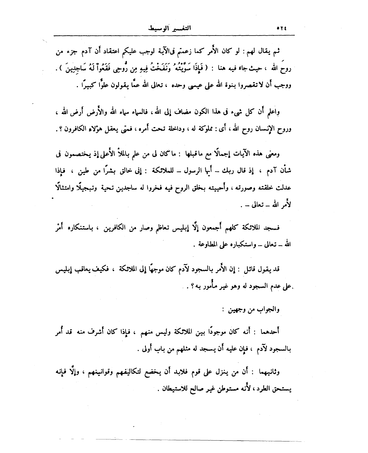 ومعنى هذه الآيات إجمالًا مع ما قبلها: ما كان لي من علم بالملأ الأعلى إذ يختصمون في شأن آدم، إذ قال ربك - أيها الرسول - للملائكة: إني خالق بشرًا من طين، فإذا عدلت خلقته وصورته، وأحييته بخلق الروح فيه فخروا له ساجدين تحية وتبجيلًا وامتثالًا لأمر الله - تعالى -.