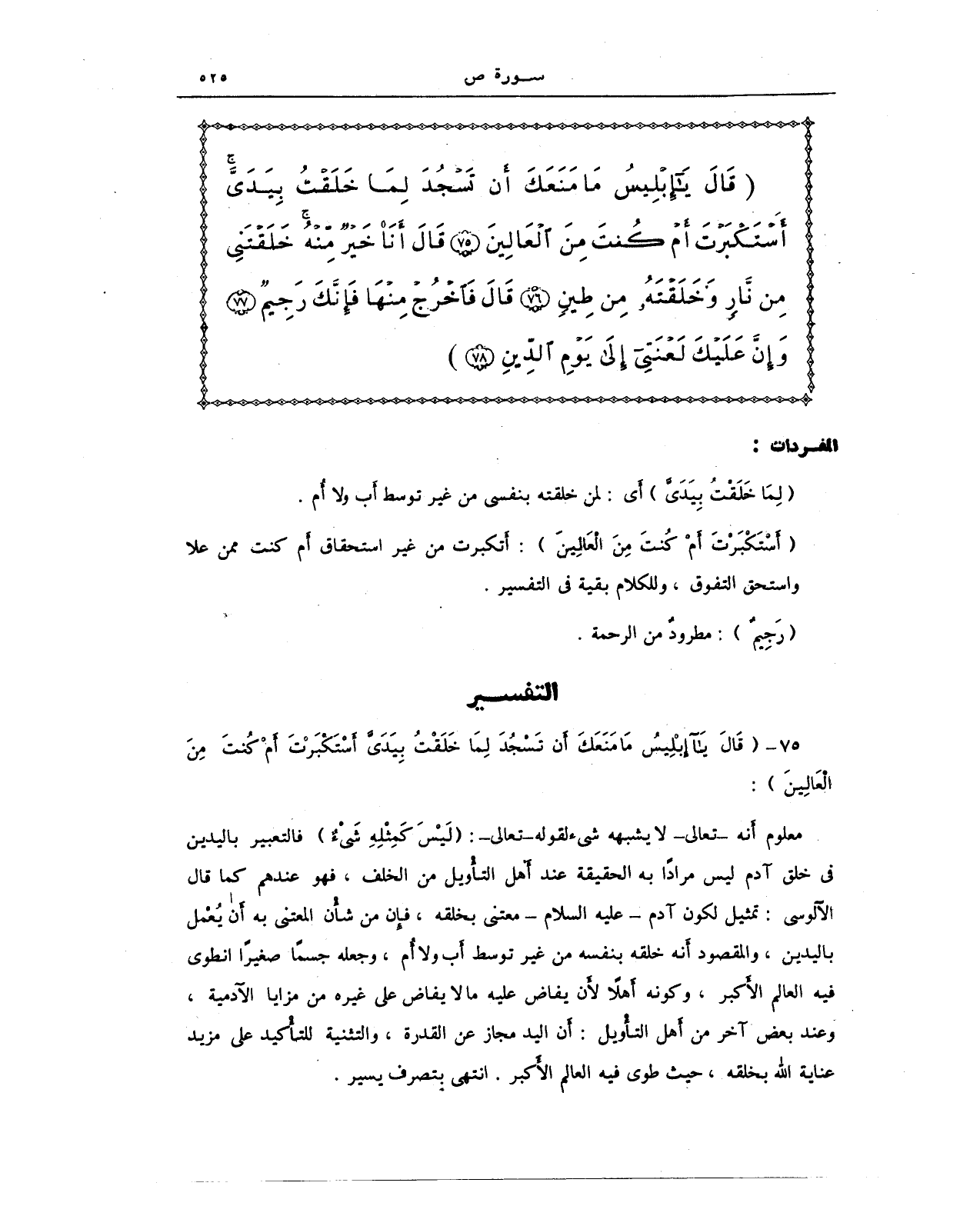 75 - {قَالَ يَا إِبْلِيسُ مَا مَنَعَكَ أَنْ تَسْجُدَ لِمَا خَلَقْتُ بِيَدَيَّ أَسْتَكْبَرْتَ أَمْ كُنْتَ مِنَ الْعَالِينَ}: