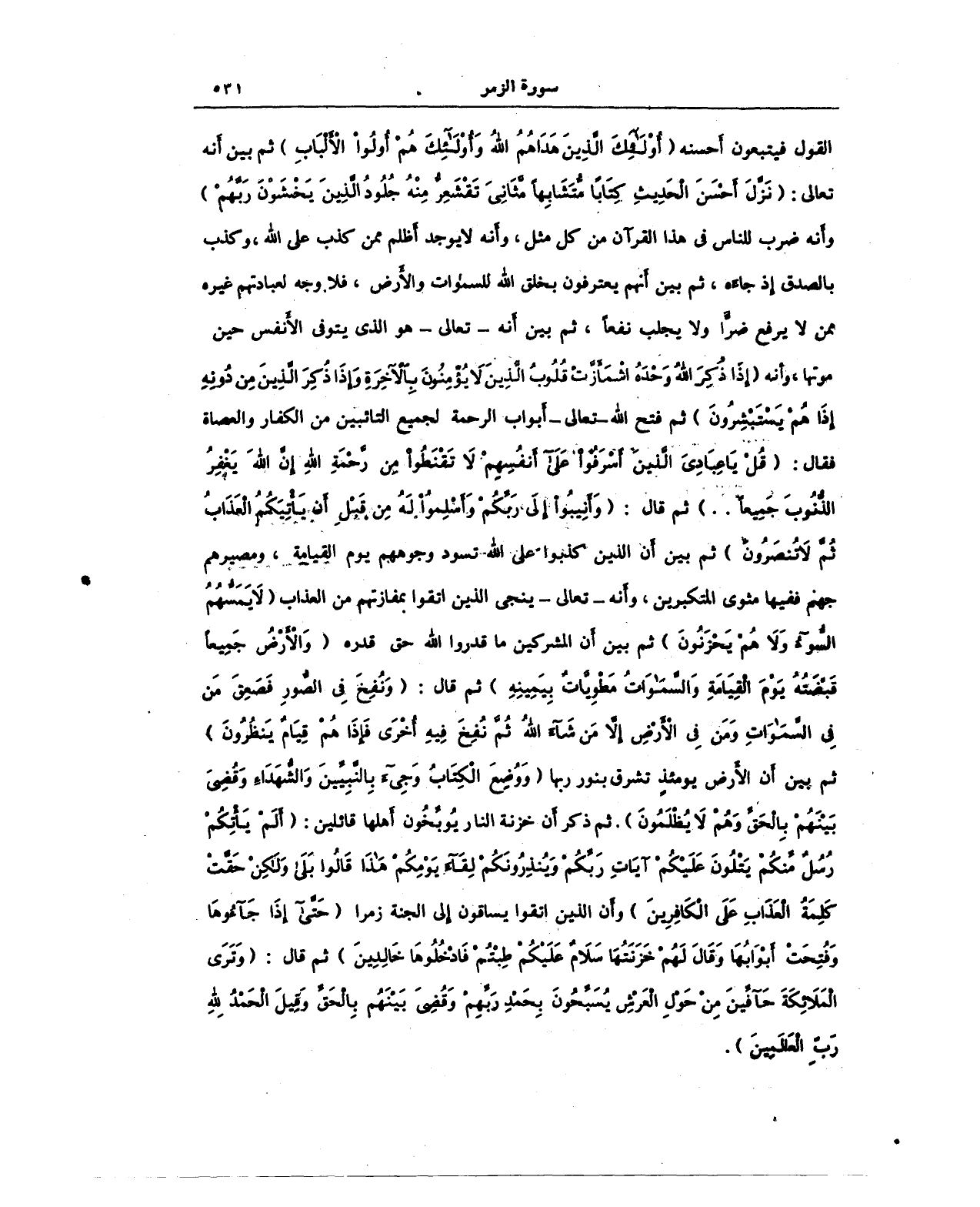 القول فيتبعون أحسنه {أُولَئِكَ الَّذِينَ هَدَاهُمُ اللَّهُ وَأُولَئِكَ هُمْ أُولُو الْأَلْبَابِ} ثم بين أنه تعالى: {نَزَّلَ أَحْسَنَ الْحَدِيثِ كِتَابًا مُتَشَابِهًا مَثَانِيَ تَقْشَعِرُّ مِنْهُ جُلُودُ الَّذِينَ يَخْشَوْنَ رَبَّهُمْ} وأنه ضرب للناس في هذا القرآن من كل مثل، وأنه لا يوجد أظلم ممن كذب على الله، وكذب بالصدق إذ جاءه، ثم بين أنهم يعترفون بخلق الله للسموات والأرض، فلا وجه لعبادته غيره ممن لا يرفع ضرًّا ولا يجلب نفعًا، ثم بين أنه - تعالى - هو الذي يتوفى الأنفس حين موتها، وأنه {وَإِذَا ذُكِرَ اللَّهُ وَحْدَهُ اشْمَأَزَّتْ قُلُوبُ الَّذِينَ لَا يُؤْمِنُونَ بِالْآخِرَةِ وَإِذَا ذُكِرَ الَّذِينَ مِنْ دُونِهِ إِذَا هُمْ يَسْتَبْشِرُونَ} ثم فتح الله - تعالى - أبواب الرحمة لجميع التائبين من الكفار والعصاة فقال: {قُلْ يَا عِبَادِيَ الَّذِينَ أَسْرَفُوا عَلَى أَنْفُسِهِمْ لَا تَقْنَطُوا مِنْ رَحْمَةِ اللَّهِ إِنَّ اللَّهَ يَغْفِرُ الذُّنُوبَ جَمِيعًا .. } ثم قال: {وأَنِيبُوا إِلَى رَبِّكُمْ وَأَسْلِمُوا لَهُ مِنْ قَبْلِ أَنْ يَأْتِيَكُمُ الْعَذَابُ ثُمَّ لَا تُنْصَرُونَ} ثم بين أن الذين كذبوا على الله تسود وجوههم يوم القيامة، ومصيرهم جنهم ففيها مثوى المتكبرين، وأنه - تعالى - ينجى الذين اتقوا بمفازتهم من العذاب {لَا يَمَسُّهُمُ السُّوءُ وَلَا هُمْ يَحْزَنُونَ} ثم بين أن الأرض يومئذ تشرق بنور ربها {وَوُضِعَ الْكِتَابُ وَجِيءَ بِالنَّبِيِّينَ وَالشُّهَدَاءِ وَقُضِيَ بَيْنَهُمْ بِالْحَقِّ وَهُمْ لَا يُظْلَمُونَ}. ثم ذكر أن خزنة النار يوبِّخون أهلها قائلين: {أَلَمْ يَأْتِكُمْ رُسُلٌ مِنْكُمْ يَتْلُونَ عَلَيْكُمْ آيَاتِ رَبِّكُمْ وَيُنْذِرُونَكُمْ لِقَاءَ يَوْمِكُمْ هَذَا قَالُوا بَلَى وَلَكِنْ حَقَّتْ كَلِمَةُ الْعَذَابِ عَلَى الْكَافِرِينَ} وأن الذين اتقوا يساقون إلى الجنة زمرا {حَتَّى إِذَا جَاءُوهَا وَفُتِحَتْ أَبْوَابُهَا وَقَالَ لَهُمْ خَزَنَتُهَا سَلَامٌ عَلَيْكُمْ طِبْتُمْ فَادْخُلُوهَا خَالِدِينَ} ثم قال: {وتَرَى الْمَلَائِكَةَ حَافِّينَ مِنْ حَوْلِ الْعَرْشِ يُسَبِّحُونَ بِحَمْدِ رَبِّهِمْ وَقُضِيَ بَيْنَهُمْ بِالْحَقِّ وَقِيلَ الْحَمْدُ لِلَّهِ رَبِّ الْعَالَمِين}.