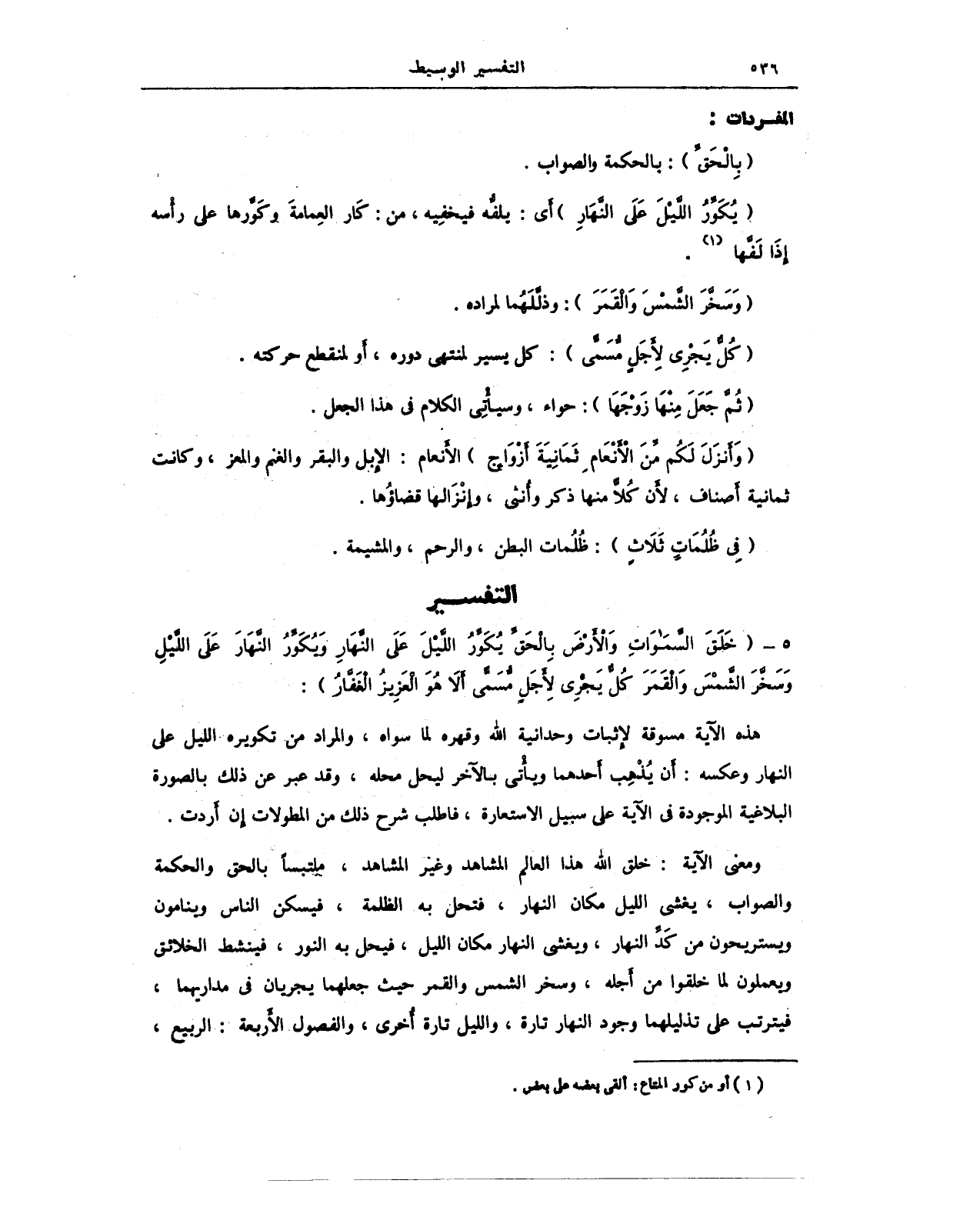 ومعنى الآية: خلق الله هذا العالم المشاهد وغير المشاهد، ملتبسًا بالحق والحكمة والصواب، يغشى الليل مكان النهار، فتحل به الظلمة، فيسكن الناس وينامون ويستريحون من كدِّ النهار، ويغشى النهار مكان الليل، فيحل به النور، فينشط الخلائق ويعملون لما خلقوا من أجله، وسخر الشمس والقمر حيث جعلهما يجريان في مداريهما، فيترتب على تذليلهما وجود النهار تارة، والليل تارة أخرى، والفصول الأربعة: الربيع،
