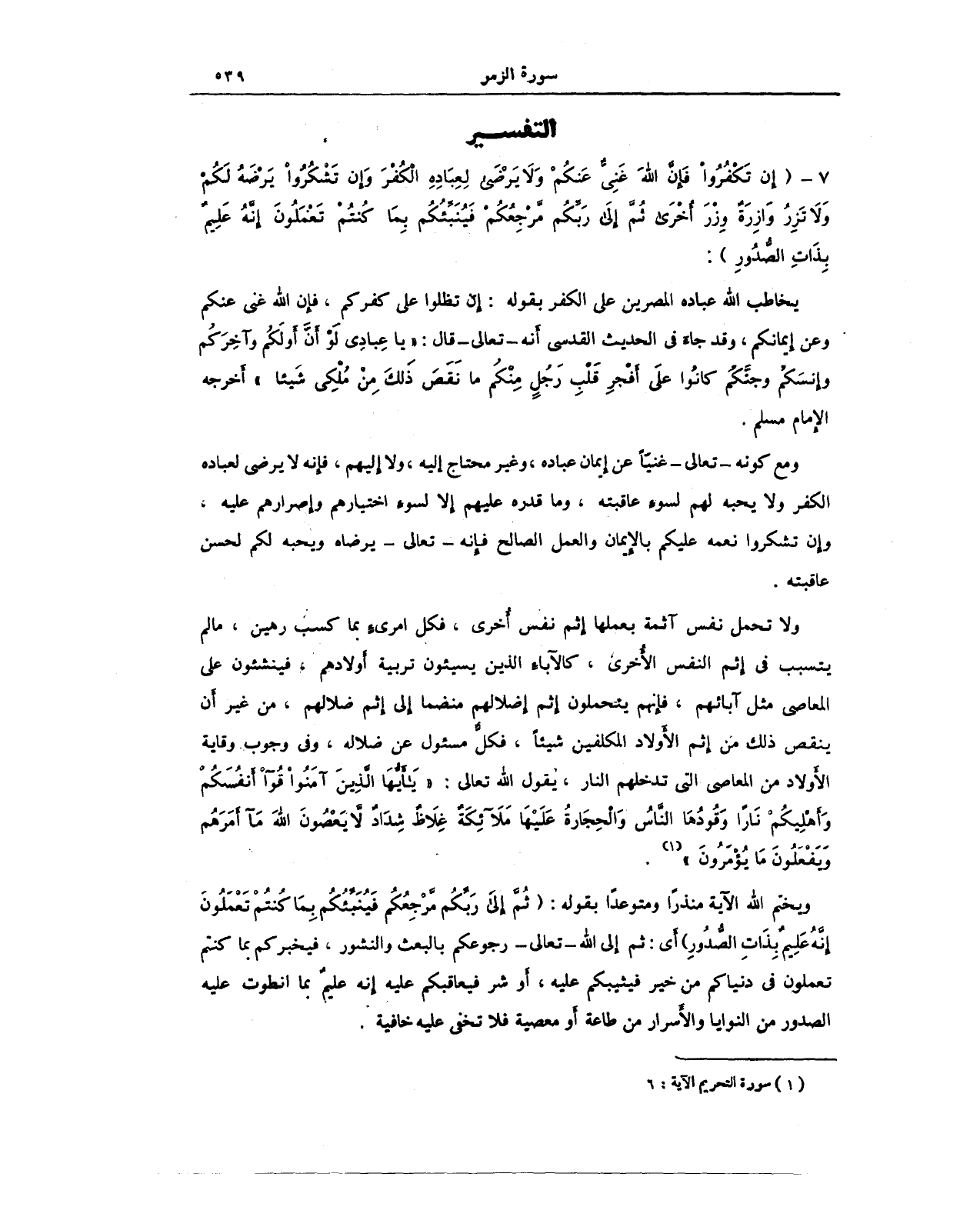 7 - {إِنْ تَكْفُرُوا فَإِنَّ اللَّهَ غَنِيٌّ عَنْكُمْ وَلَا يَرْضَى لِعِبَادِهِ الْكُفْرَ وَإِنْ تَشْكُرُوا يَرْضَهُ لَكُمْ وَلَا تَزِرُ وَازِرَةٌ وِزْرَ أُخْرَى ثُمَّ إِلَى رَبِّكُمْ مَرْجِعُكُمْ فَيُنَبِّئُكُمْ بِمَا كُنْتُمْ تَعْمَلُونَ إِنَّهُ عَلِيمٌ بِذَاتِ الصُّدُورِ}: