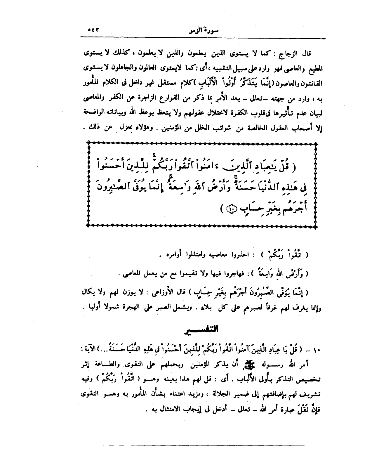 {إنَّمَا يُوَفَّى الصَّابِرُونَ أَجْرَهُمْ بِغَيْرِ حِسَابٍ} قال الأوزاعى: لا يوزن لهم ولا يكال وإنما يغرف لهم غرفًا لصبرهم على كل بلاءٍ. ويشمل الصبر على الهجرة شمولا أوليا.