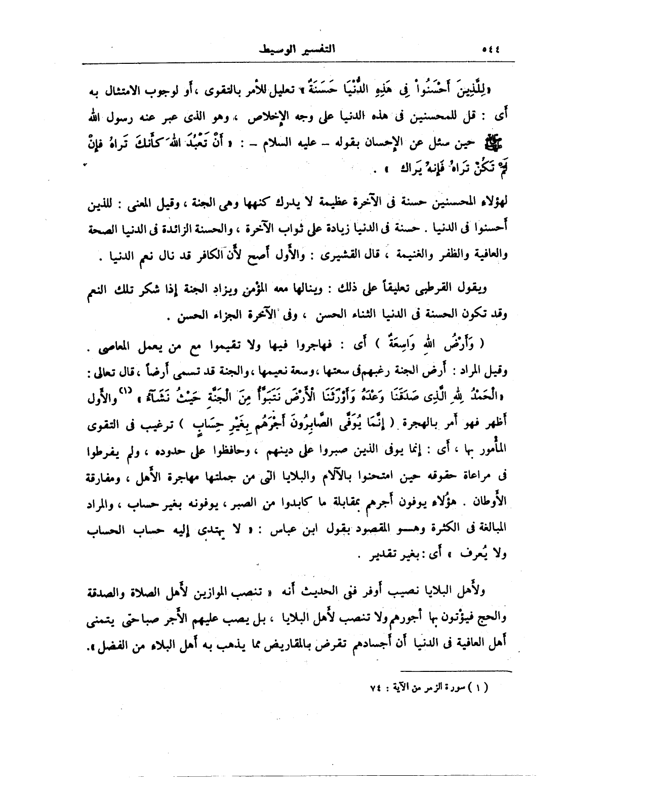 {وأرض الله واسعةٌ} أي: فهاجروا فيها ولا تقيموا مع من يعمل المعاصي. وقيل المراد: أرض الجنة رغهم في سعتها، وسعة نعيمها، والجنة قد تسمى أرضًا، قال تعالى: {الْحَمْدُ لِلَّهِ الَّذِي صَدَقَنَا وَعْدَهُ وَأَوْرَثَنَا الْأَرْضَ نَتَبَوَّأُ مِنَ الْجَنَّةِ حَيْثُ نَشَاءُ} (¬1) والأول أظهر فهو أمر بالهجرة. {إِنَّمَا يُوَفَّى الصَّابِرُونَ أَجْرَهُمْ بِغَيْرِ حِسَابٍ} ترغيب في التقوى المأمور بها، أي: إنما يوفى الذين صبروا على دينهم، وحافظوا على حدوده، ولم يفرطوا في مراعاة حقوقه حين امتحنوا بالآلام والبلايا التي من جملتها مهاجرة الأهل، ومفارقة الأوطان. هؤلاء يوفون أجرهم بمقابلة ما كابدوا من الصبر، يوفونه بغير حساب، والمراد المبالغة في الكثرة وهو المقصود بقول ابن عباس: "لا يهتدى إليه حساب الحساب ولا يُعرف" أي: بغير تقدير.