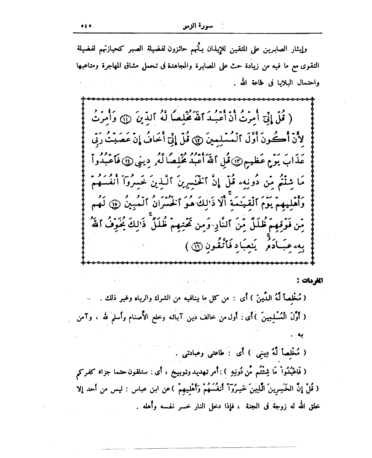 {قُلْ إِنِّي أُمِرْتُ أَنْ أَعْبُدَ اللَّهَ مُخْلِصًا لَهُ الدِّينَ (11) وَأُمِرْتُ لِأَنْ أَكُونَ أَوَّلَ الْمُسْلِمِينَ (12) قُلْ إِنِّي أَخَافُ إِنْ عَصَيْتُ رَبِّي عَذَابَ يَوْمٍ عَظِيمٍ (13) قُلِ اللَّهَ أَعْبُدُ مُخْلِصًا لَهُ دِينِي (14) فَاعْبُدُوا مَا شِئْتُمْ مِنْ دُونِهِ قُلْ إِنَّ الْخَاسِرِينَ الَّذِينَ خَسِرُوا أَنْفُسَهُمْ وَأَهْلِيهِمْ يَوْمَ الْقِيَامَةِ أَلَا ذَلِكَ هُوَ الْخُسْرَانُ الْمُبِينُ (15) لَهُمْ مِنْ فَوْقِهِمْ ظُلَلٌ مِنَ النَّارِ وَمِنْ تَحْتِهِمْ ظُلَلٌ ذَلِكَ يُخَوِّفُ اللَّهُ بِهِ عِبَادَهُ يَا عِبَادِ فَاتَّقُونِ}