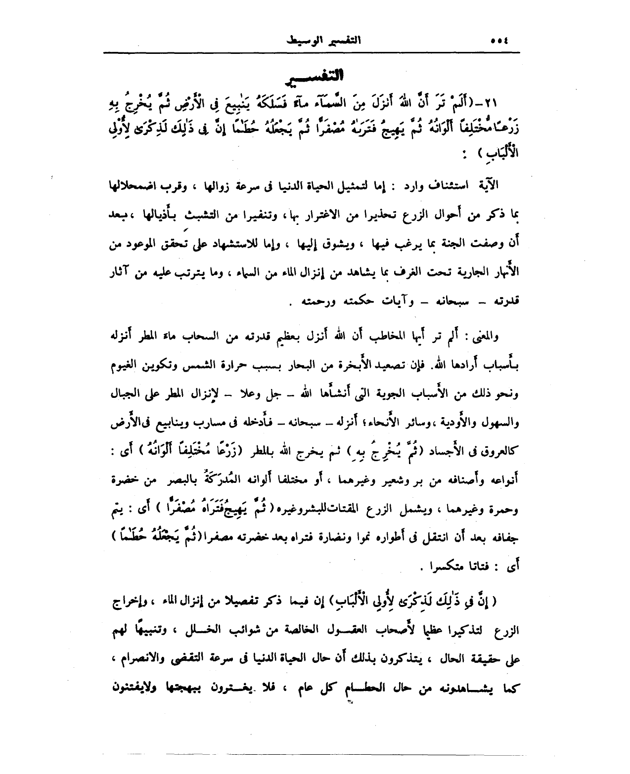 الآية استئناف وارد: إما لتمثيل الحياة الدنيا في سرعة زوالها، وقرب اضمحلالها بما ذكر من أحوال الزرع تحذيرا من الاغترار بها، وتنفيرا من التشبث بأذيالها، بعد أن وصفت الجنة بما يرغب فيها، ويشوق إليها، وإما للاستشهاد على تحقق الموعود من الأنهار الجارية تحت الغرف بما يشاهد من إنزال الماء من السماء، وما يترتب عليه من آثار قدرته - سبحانه - وآيات حكمته ورحمته.