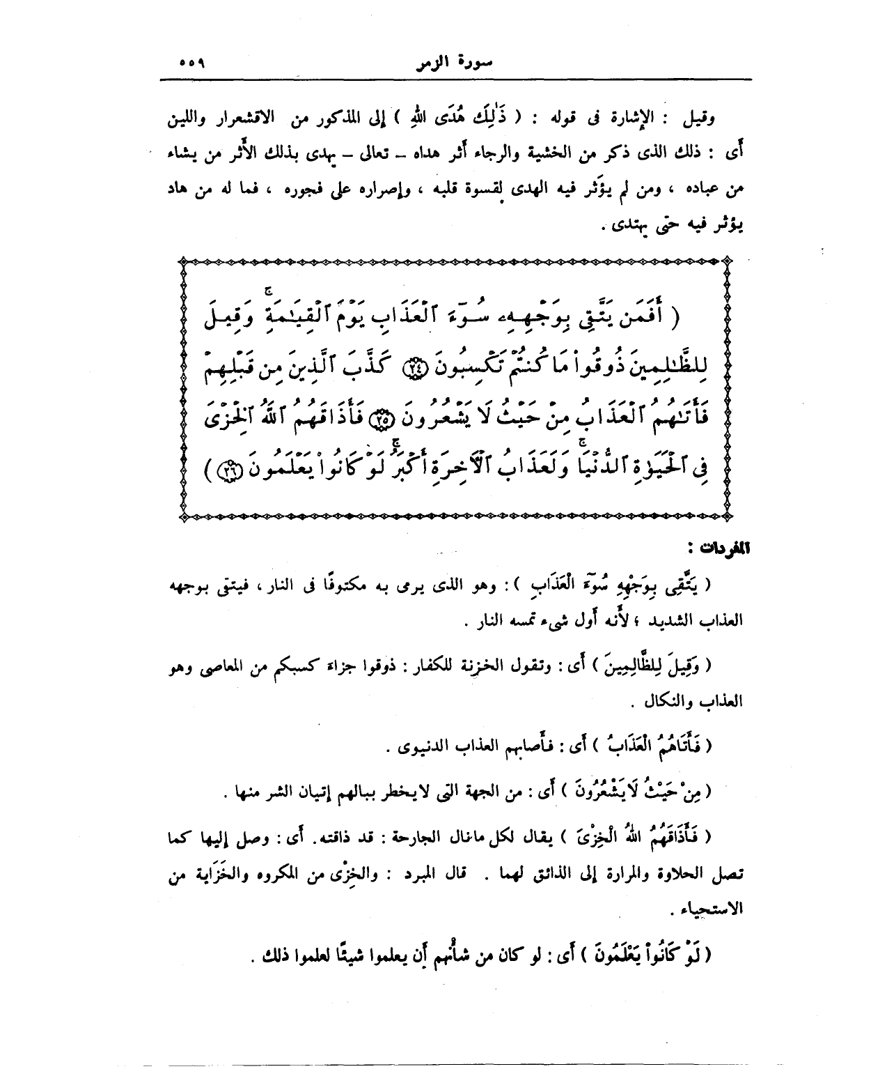 {أَفَمَنْ يَتَّقِي بِوَجْهِهِ سُوءَ الْعَذَابِ يَوْمَ الْقِيَامَةِ وَقِيلَ لِلظَّالِمِينَ ذُوقُوا مَا كُنْتُمْ تَكْسِبُونَ (24) كَذَّبَ الَّذِينَ مِنْ قَبْلِهِمْ فَأَتَاهُمُ الْعَذَابُ مِنْ حَيْثُ لَا يَشْعُرُونَ (25) فَأَذَاقَهُمُ اللَّهُ الْخِزْيَ فِي الْحَيَاةِ الدُّنْيَا وَلَعَذَابُ الْآخِرَةِ أَكْبَرُ لَوْ كَانُوا يَعْلَمُونَ (26)}