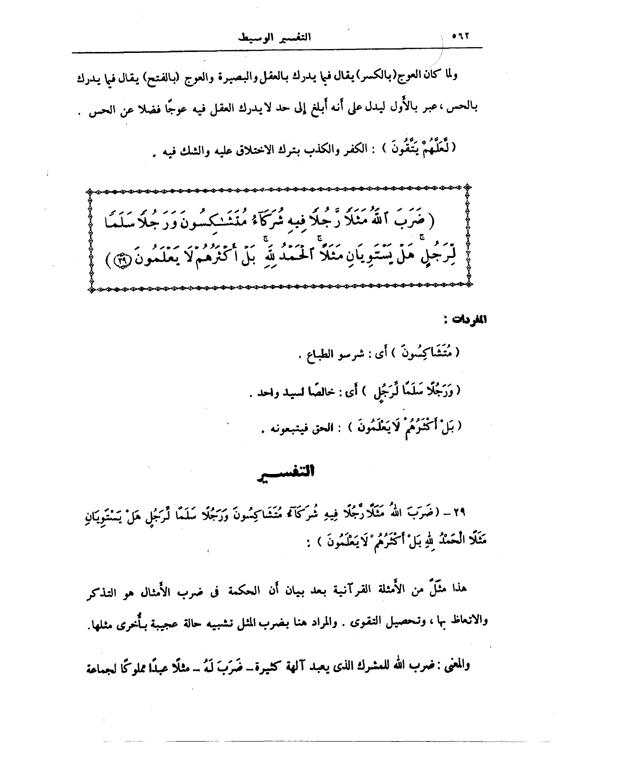 {ضَرَبَ اللَّهُ مَثَلًا رَجُلًا فِيهِ شُرَكَاءُ مُتَشَاكِسُونَ وَرَجُلًا سَلَمًا لِرَجُلٍ هَلْ يَسْتَوِيَانِ مَثَلًا الْحَمْدُ لِلَّهِ بَلْ أَكْثَرُهُمْ لَا يَعْلَمُونَ (29)}