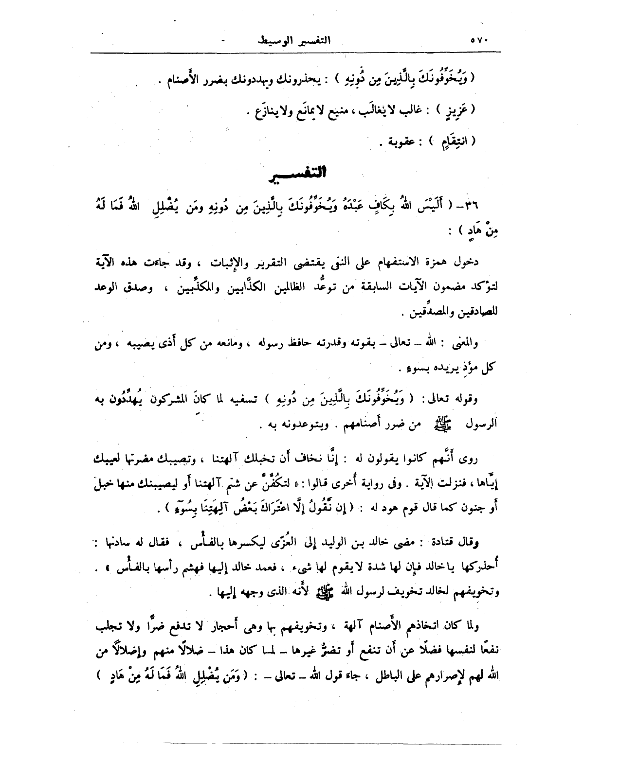 36 - {أَلَيْسَ اللَّهُ بِكَافٍ عَبْدَهُ وَيُخَوِّفُونَكَ بِالَّذِينَ مِنْ دُونِهِ وَمَنْ يُضْلِلِ اللَّهُ فَمَا لَهُ مِنْ هَادٍ}: