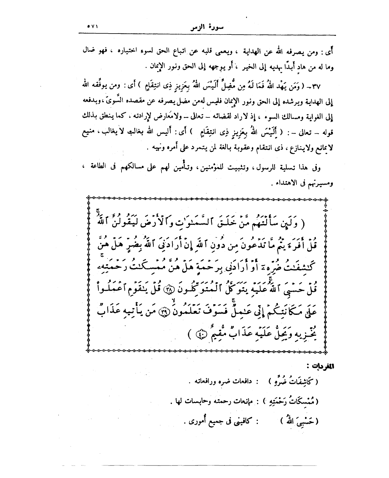 37 - {وَمَنْ يَهْدِ اللَّهُ فَمَا لَهُ مِنْ مُضِلٍّ أَلَيْسَ اللَّهُ بِعَزِيزٍ ذِي انْتِقَامٍ} أي: ومن يوفِّقه الله إلى الهداية ويرشده إلى الحق ونور الإيمان فليس له من مضل يصرفه عن مقصده السَّويِّ، ويدفعه إلى الغواية ومسالك السوء، إذ لا راد لقضائه - تعالى - ولا معارض لإرادته. كما ينطق بذلك قوله - تعالى -: {أَلَيْسَ اللَّهُ بِعَزِيزٍ ذِي انْتِقَامٍ} أي: أليس الله بغالب لا يغالب، منيع لا يمانع ولا ينازع، ذي انتقام وعقوبة بالغة لمن يتمرد على أمره وينهيه.