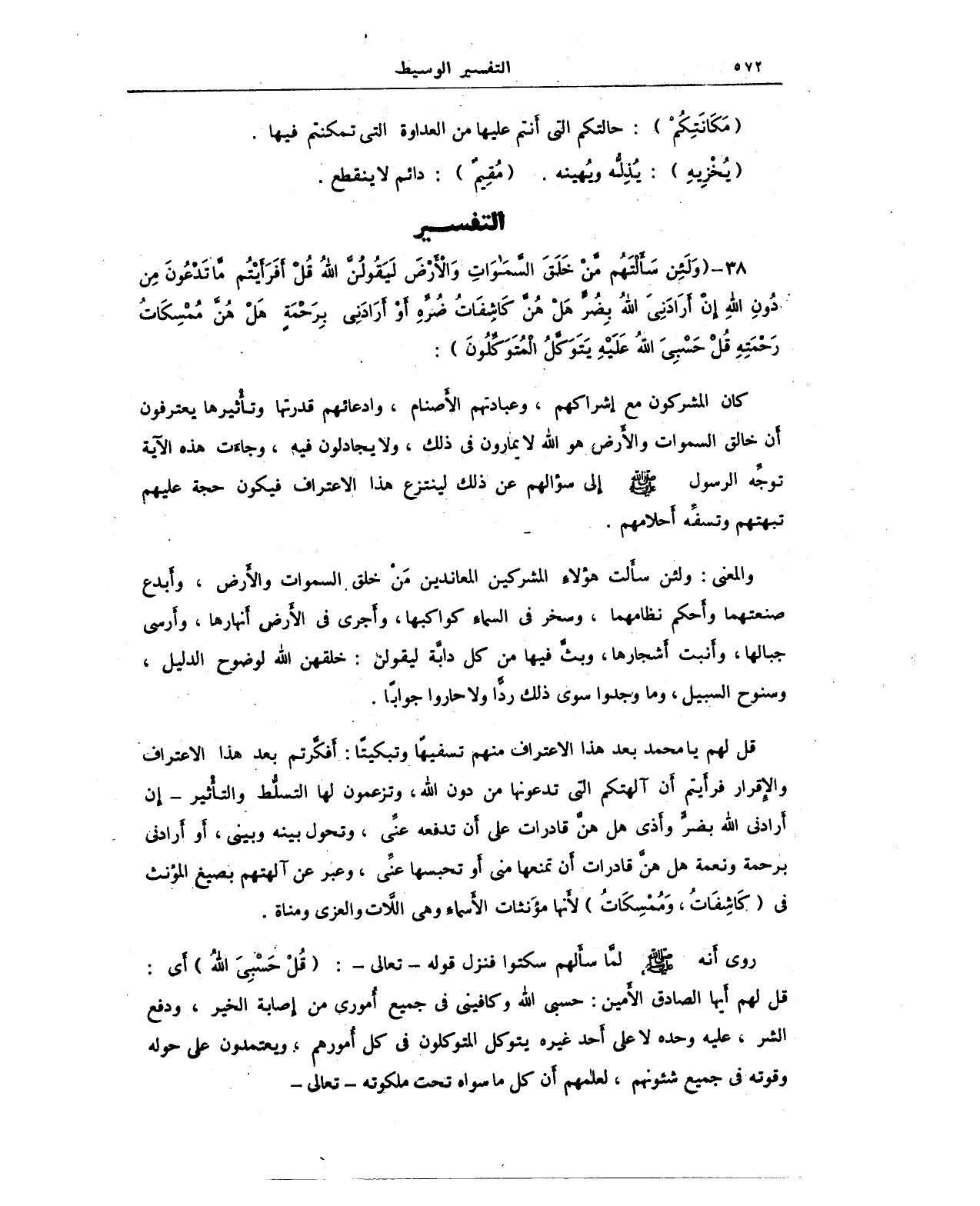 38 - {وَلَئِنْ سَأَلْتَهُمْ مَنْ خَلَقَ السَّمَاوَاتِ وَالْأَرْضَ لَيَقُولُنَّ اللَّهُ قُلْ أَفَرَأَيْتُمْ مَا تَدْعُونَ مِنْ دُونِ اللَّهِ إِنْ أَرَادَنِيَ اللَّهُ بِضُرٍّ هَلْ هُنَّ كَاشِفَاتُ ضُرِّهِ أَوْ أَرَادَنِي بِرَحْمَةٍ هَلْ هُنَّ مُمْسِكَاتُ رَحْمَتِهِ قُلْ حَسْبِيَ اللَّهُ عَلَيْهِ يَتَوَكَّلُ الْمُتَوَكِّلُونَ}: