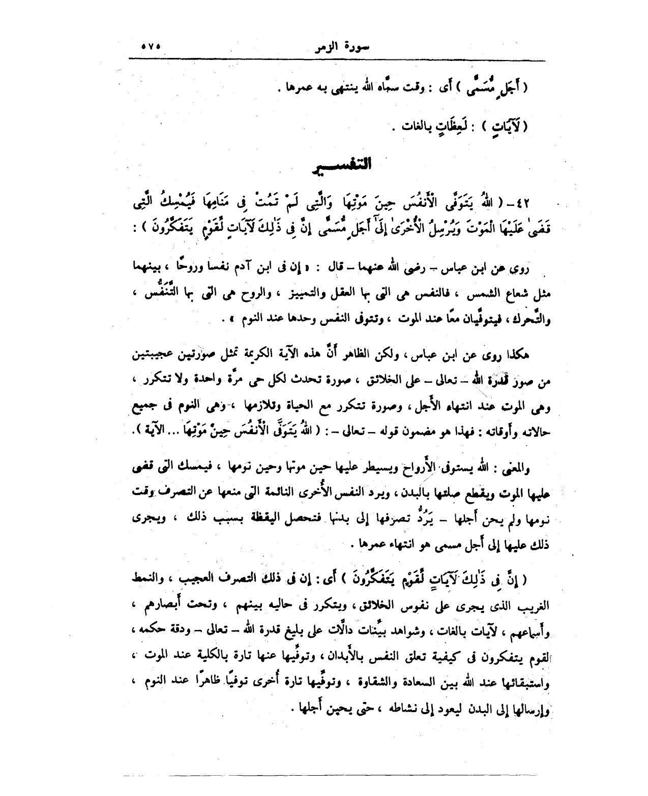 هكذا روي عن ابن عباس، ولكن الظاهر أن هذه الآية الكريمة تمثل صورتين عجيبتين من صور قدرة الله - تعالى - على الخلائق، صورة تحدث لكل حي مرة واحدة ولا تتكرر، وهي الموت عند انتهاء الأجل، وصورة تتكرر مع الحياة وتلازمها، وهي النوم في جميع حالاته وأوقاته: فهذا هو مضمون قوله - تعالى -: {اللَّهُ يَتَوَفَّى الْأَنْفُسَ حِينَ مَوْتِهَا ... الآية}.