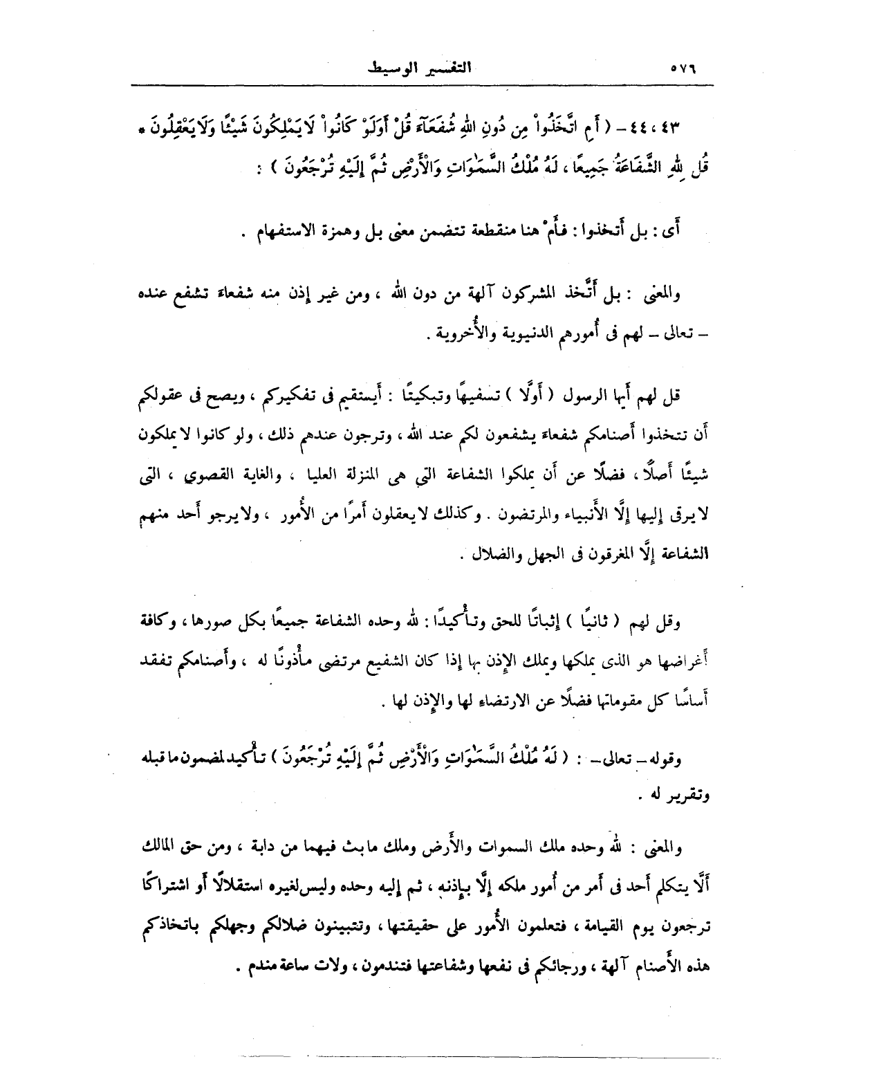 43، 44 - {أَمِ اتَّخَذُوا مِنْ دُونِ اللَّهِ شُفَعَاءَ قُلْ أَوَلَوْ كَانُوا لَا يَمْلِكُونَ شَيْئًا وَلَا يَعْقِلُونَ. قُلْ لِلَّهِ الشَّفَاعَةُ جَمِيعًا لَهُ مُلْكُ السَّمَاوَاتِ وَالْأَرْضِ ثُمَّ إِلَيْهِ تُرْجَعُونَ}: