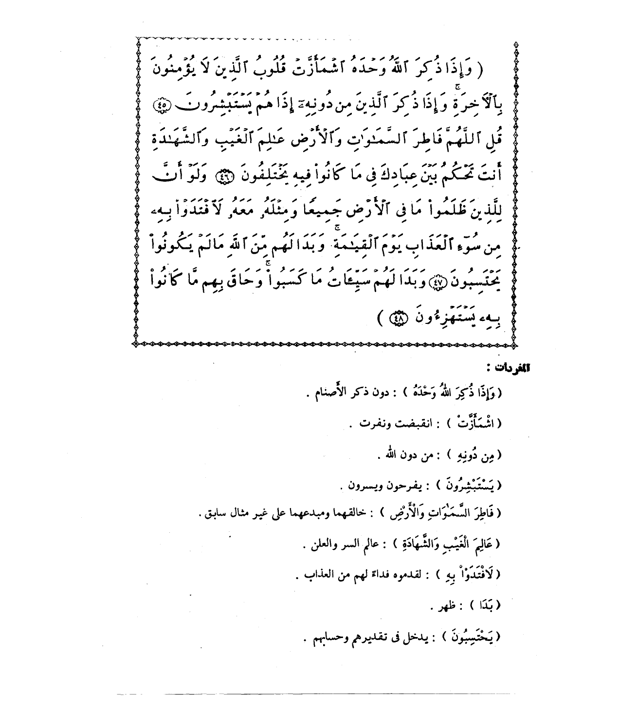 {وَإِذَا ذُكِرَ اللَّهُ وَحْدَهُ اشْمَأَزَّتْ قُلُوبُ الَّذِينَ لَا يُؤْمِنُونَ بِالْآخِرَةِ وَإِذَا ذُكِرَ الَّذِينَ مِنْ دُونِهِ إِذَا هُمْ يَسْتَبْشِرُونَ (45) قُلِ اللَّهُمَّ فَاطِرَ السَّمَاوَاتِ وَالْأَرْضِ عَالِمَ الْغَيْبِ وَالشَّهَادَةِ أَنْتَ تَحْكُمُ بَيْنَ عِبَادِكَ فِي مَا كَانُوا فِيهِ يَخْتَلِفُونَ (46) وَلَوْ أَنَّ لِلَّذِينَ ظَلَمُوا مَا فِي الْأَرْضِ جَمِيعًا وَمِثْلَهُ مَعَهُ لَافْتَدَوْا بِهِ مِنْ سُوءِ الْعَذَابِ يَوْمَ الْقِيَامَةِ وَبَدَا لَهُمْ مِنَ اللَّهِ مَا لَمْ يَكُونُوا يَحْتَسِبُونَ (47) وَبَدَا لَهُمْ سَيِّئَاتُ مَا كَسَبُوا وَحَاقَ بِهِمْ مَا كَانُوا بِهِ يَسْتَهْزِئُونَ (48)}