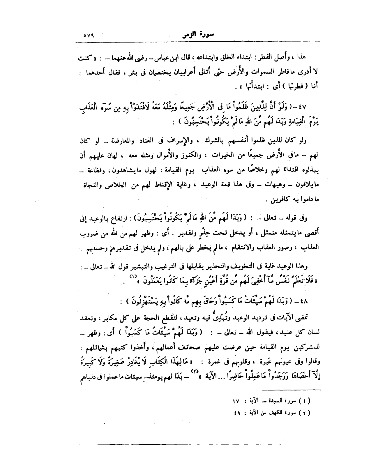وفي قوله - تعالى -: {وَبَدَا لَهُمْ مِنَ اللَّهِ مَا لَمْ يَكُونُوا يَحْتَسِبُونَ}: ارتفاع بالوعيد إلى أقصى ما يتمثله متمثل، أو يدخل تحت حِذْرٍ وتقدير. أي: وظهر لهم من الله من ضروب العذاب، وصور العقاب والانتقام، ما لم يخطر على بالهم، ولم يدخل في تقديرهم وحسابهم.