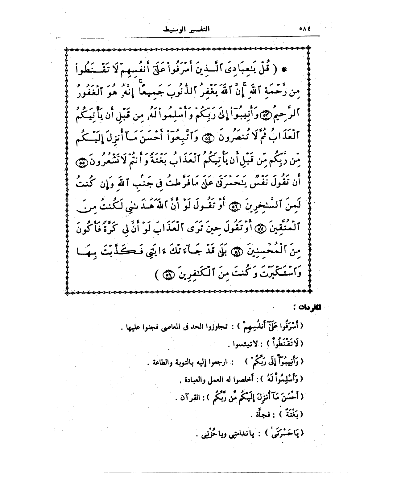 {قُلْ يَا عِبَادِيَ الَّذِينَ أَسْرَفُوا عَلَى أَنْفُسِهِمْ لَا تَقْنَطُوا مِنْ رَحْمَةِ اللَّهِ إِنَّ اللَّهَ يَغْفِرُ الذُّنُوبَ جَمِيعًا إِنَّهُ هُوَ الْغَفُورُ الرَّحِيمُ (53) وَأَنِيبُوا إِلَى رَبِّكُمْ وَأَسْلِمُوا لَهُ مِنْ قَبْلِ أَنْ يَأْتِيَكُمُ الْعَذَابُ ثُمَّ لَا تُنْصَرُونَ (54) وَاتَّبِعُوا أَحْسَنَ مَا أُنْزِلَ إِلَيْكُمْ مِنْ رَبِّكُمْ مِنْ قَبْلِ أَنْ يَأْتِيَكُمُ الْعَذَابُ بَغْتَةً وَأَنْتُمْ لَا تَشْعُرُونَ (55) أَنْ تَقُولَ نَفْسٌ يَا حَسْرَتَا عَلَى مَا فَرَّطْتُ فِي جَنْبِ اللَّهِ وَإِنْ كُنْتُ لَمِنَ السَّاخِرِينَ (56) أَوْ تَقُولَ لَوْ أَنَّ اللَّهَ هَدَانِي لَكُنْتُ مِنَ الْمُتَّقِينَ (57) أَوْ تَقُولَ حِينَ تَرَى الْعَذَابَ لَوْ أَنَّ لِي كَرَّةً فَأَكُونَ مِنَ الْمُحْسِنِينَ (58) بَلَى قَدْ جَاءَتْكَ آيَاتِي فَكَذَّبْتَ بِهَا وَاسْتَكْبَرْتَ وَكُنْتَ مِنَ الْكَافِرِينَ (59)}