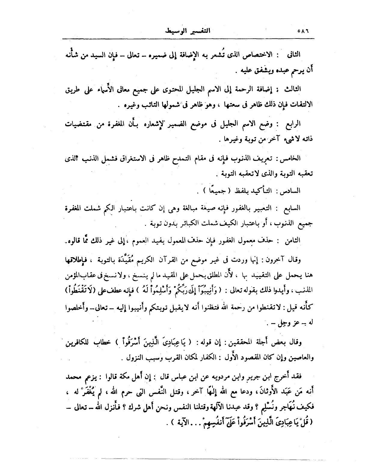 وقال آخرون: إنها وردت في غير موضع من القرآن الكريم مُقَيَّدَة بالتوبة، فإطلاقها هنا يحمل على التقييد بها، لأن المطلق يحمل على المقيد ما لم ينسخ، ولا نسخ في عقاب المؤمن المذنب، وأيدوا ذلك بقوله تعالى: {وَأَنِيبُوا إِلَى رَبِّكُمْ وَأَسْلِمُوا لَهُ} فإنه عطف على {لَا تَقْنَطُوا} كأنه قيل: لا تقنطوا من رحمة الله فتظنوا أنه لا يقبل توبتكم وأنيبوا إليه - تعالى - وأخلصوا له - عَزَّ وَجَلَّ -.