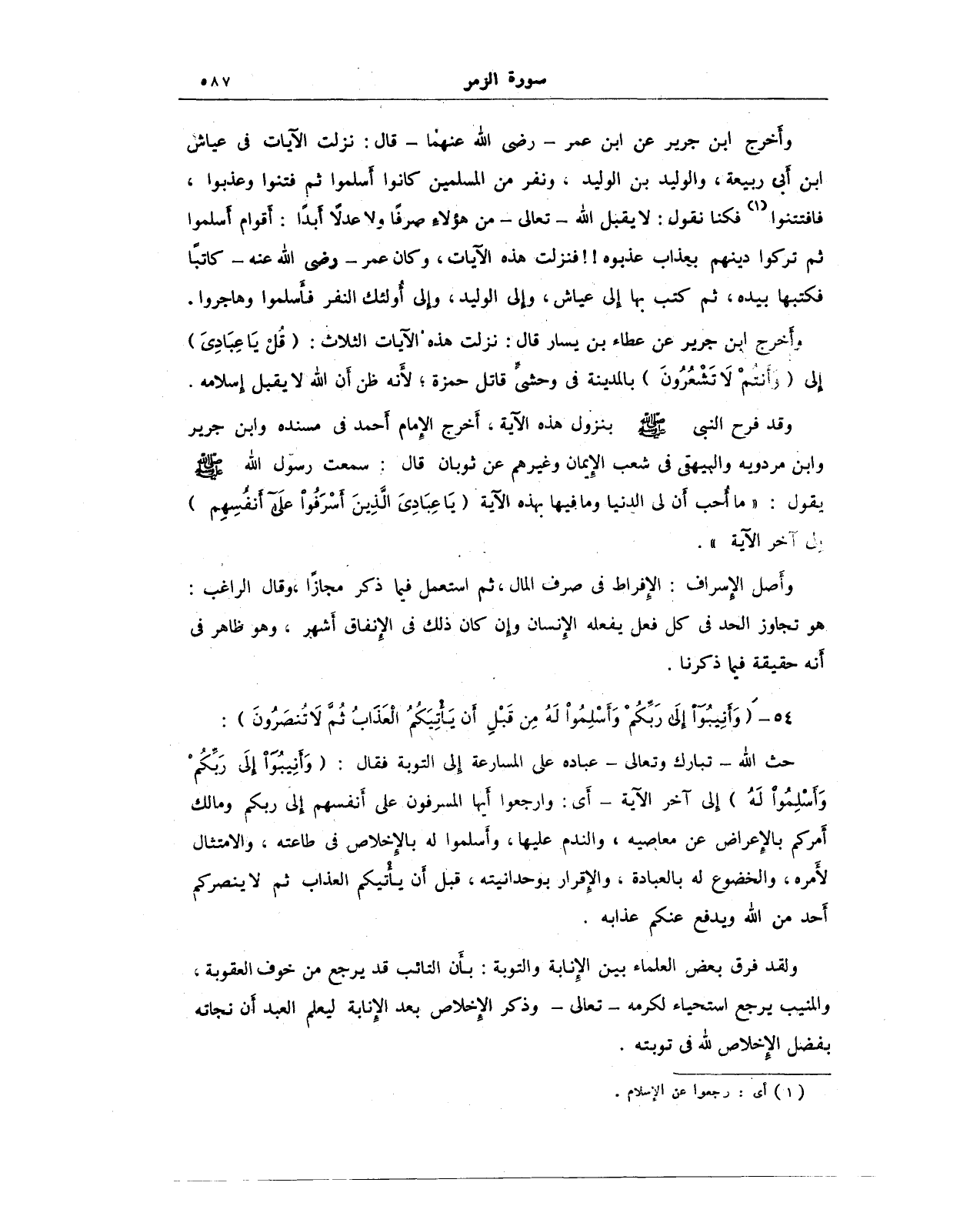 وأخرج ابن جرير عن ابن عمر - رضي الله عنهما - قال: نزلت الآيات في عياش ابن أبي ربيعة، والوليد بن الوليد، ونفر من المسلمين كانوا أسلموا ثم فتنوا وعذبوا، فافتتنوا (¬1) فكنا نقول: لا يقبل الله - تعالى - من هؤلاء صرفًا ولا عدلًا أبدًا: أقوام أسلموا ثم تركوا دينهم بعذاب عذبوه!! فنزلت هذه الآيات، وكان عمر - رضي الله عنه - كاتبًا فكتبها بيده، ثم كتب بها إلى عياش، وإلى الوليد، وإلى أولئك النفر فأسلموا وهاجروا.