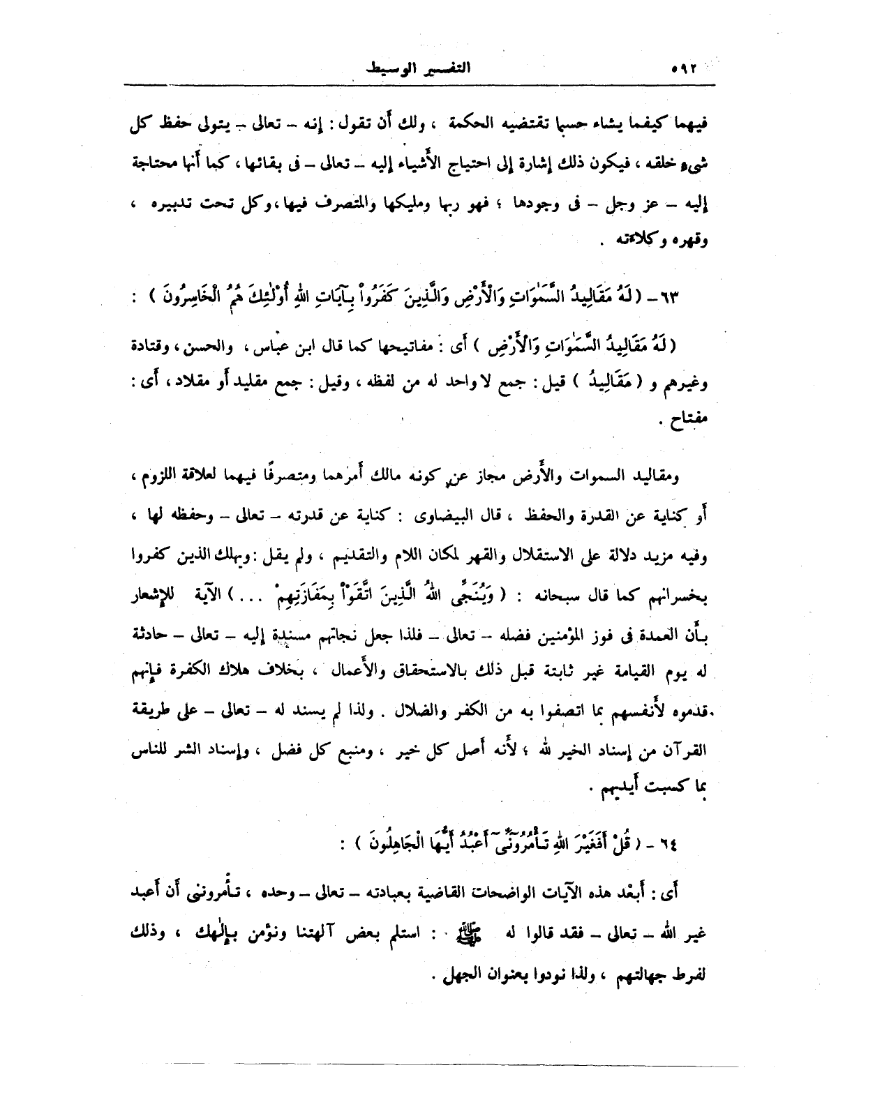 ومقاليد السموات والأرض مجاز عن كونه مالك أمرهما ومتصرفًا فيهما لعلاقة اللزوم، أو كناية عن القدرة والحفظ، قال البيضاوى: كناية عن قدرته - تعالى - وحفظه لها، وفيه مزيد دلالة على الاستقلال والقهر لمكان اللام والتقديم، ولم يقل: ويهلك الذين كفروا بخسرانهم كما قال سبحانه: {وَيُنَجِّي اللَّهُ الَّذِينَ اتَّقَوْا بِمَفَازَتِهِمْ ... } الآية للإشعار بأن العمدة في فوز المؤمنين فضله - تعالى - فلذا جعل نجاتهم مسندة إليه - تعالى - حادثة له يوم القيامة غير ثابتة قبل ذلك بالاستحقاق والأعمال، بخلاف هلاك الكفرة فإنهم قدموه لأنفسهم بما اتصفوا به من الكفر والضلال. ولذا لم يسند له - تعالى - على طريقة القرآن من إسناد الخير لله؛ لأنه أصل كل خير، ومنبع كل فضل، وإسناد الشر للناس بما كسبت أيديهم.