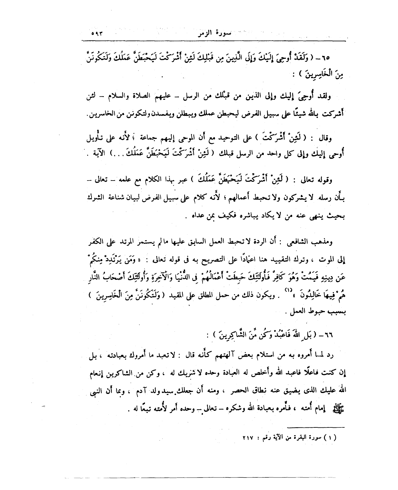 ومذهب الشافعي: أن الردة لا تحبط العمل السابق عليها ما لم يستمر المرتد على الكفر إلى الموت، وترك التقييد هنا اعتمادًا على التصريح به في قوله تعالى: {وَمَنْ يَرْتَدِدْ مِنْكُمْ عَنْ دِينِهِ فَيَمُتْ وَهُوَ كَافِرٌ فَأُولَئِكَ حَبِطَتْ أَعْمَالُهُمْ فِي الدُّنْيَا وَالْآخِرَةِ وَأُولَئِكَ أَصْحَابُ النَّارِ هُمْ فِيهَا خَالِدُونَ} (¬1). ويكون ذلك من حمل المطلق على المقيد {وَلَتَكُونَنَّ مِنَ الْخَاسِرِينَ} بسبب حبوط العمل.