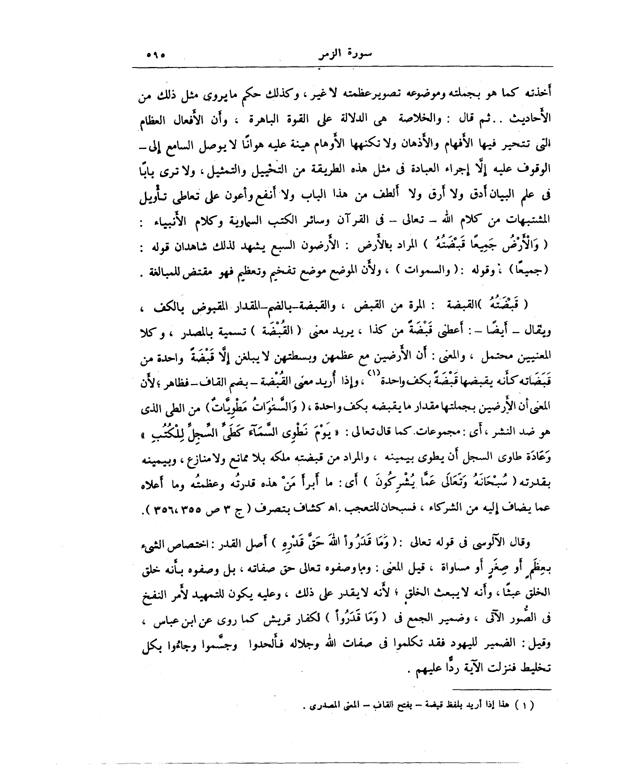 أخذته كما هو بجملته وموضوعه تصوير عظمته لا غير، وكذلك حكم ما يروي مثل ذلك من الأحاديث .. ثم قال: والخلاصة هي الدلالة على القوة الباهرة: وأن الأفعال العظام التي تتحير فيها الأفهام والأذهان ولا تكنهها الأوهام هيئة عليه هوانًا لا يوصل السامع إلى - الوقوف عليه إلَّا إجراء العبادة في مثل هذه الطريقة من التخييل والتمثيل، ولا ترى بابًا في علم البيان أدق ولا أرق ولا ألطف من هذا الباب ولا أنفع وأعون على تعاطى تأويل المشتبهات من كلام الله - تعالى - في القرآن وسائر الكتب السماوية وكلام الأنبياء: {وَالْأَرْضُ جَمِيعًا قَبْضَتُهُ} المراد بالأرض: الأرضون السبع يشهد لذلك شاهدان قوله: {جَمِيعًا}، وقوله: {وَالسَّمَاوَاتُ}، ولأن الموضع موضع تفخيم وتعظيم فهو مقتض للمبالغة.