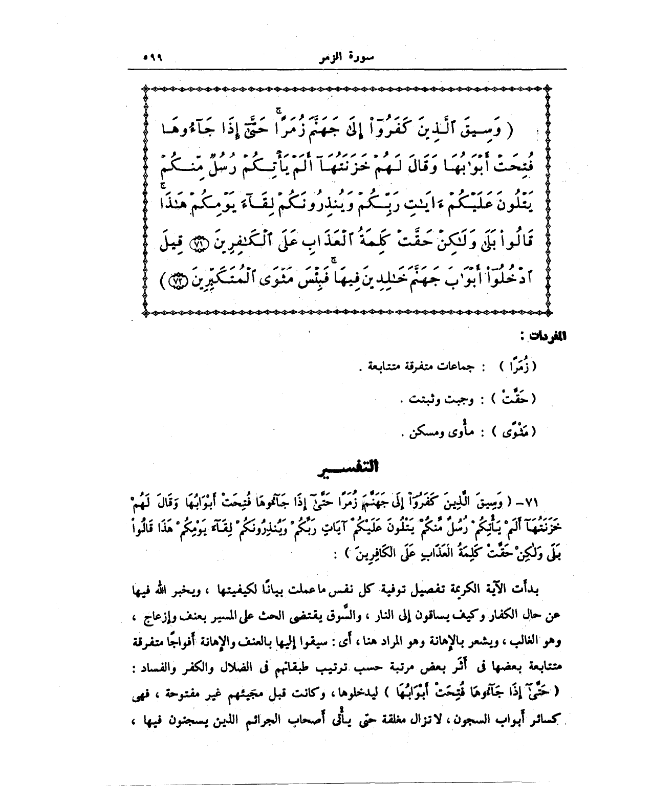 بدأت الآية الكريمة تفصيل توفية كل نفس ما عملت بيانًا لكيفيتها، ويخبر الله فيها عن حال الكفار وكيف يساقون إلى النار، والسُّوق يقتضي الحث على المسير بعنف وإزعاج، وهو الغالب، ويشعر بالإهانة وهو المراد هنا، أي: سيقوا إليها بالعنف والإهانة أفواجًا متفرقة متتابعة بعضها في أثَر بعض مرتبة حسب ترتيب طبقاتهم في الضلال والكفر والفساد: {حَتَّى إِذَا جَاءُوهَا فُتِحَتْ أَبْوَابُهَا} ليدخلوها، وكانت قبل مجيئهم غير مفتوحة، فهي كسائر أبواب السجون، لا تزال مغلقة حتى يأتي أصحاب الجرائم الذين يسجنون فيها،