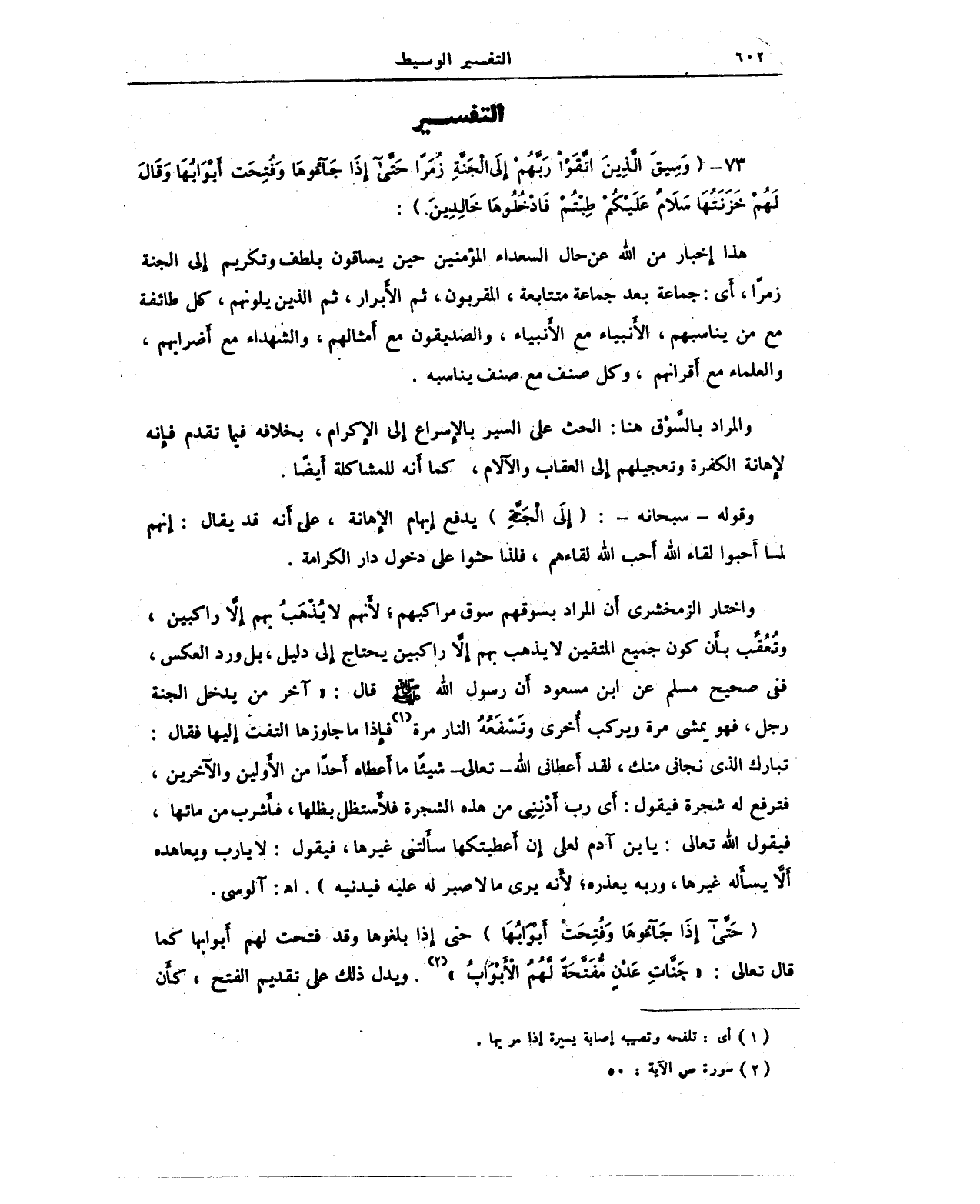 73 - {وَسِيقَ الَّذِينَ اتَّقَوْا رَبَّهُمْ إِلَى الْجَنَّةِ زُمَرًا حَتَّى إِذَا جَاءُوهَا وَفُتِحَتْ أَبْوَابُهَا وَقَالَ لَهُمْ خَزَنَتُهَا سَلَامٌ عَلَيْكُمْ طِبْتُمْ فَادْخُلُوهَا خَالِدِينَ}: