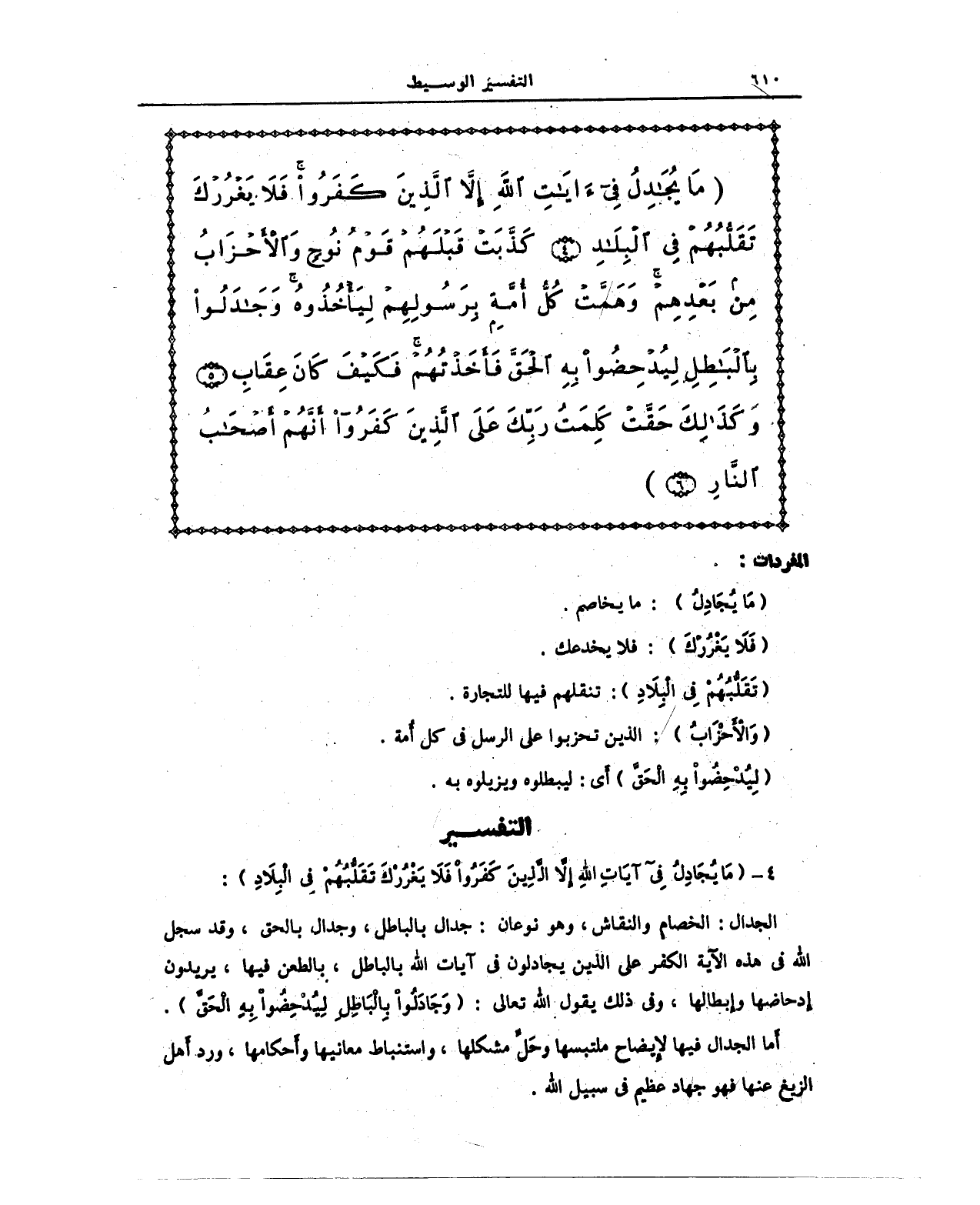 {مَا يُجَادِلُ فِي آيَاتِ اللَّهِ إِلَّا الَّذِينَ كَفَرُوا فَلَا يَغْرُرْكَ تَقَلُّبُهُمْ فِي الْبِلَادِ (4) كَذَّبَتْ قَبْلَهُمْ قَوْمُ نُوحٍ وَالْأَحْزَابُ مِنْ بَعْدِهِمْ وَهَمَّتْ كُلُّ أُمَّةٍ بِرَسُولِهِمْ لِيَأْخُذُوهُ وَجَادَلُوا بِالْبَاطِلِ لِيُدْحِضُوا بِهِ الْحَقَّ فَأَخَذْتُهُمْ فَكَيْفَ كَانَ عِقَابِ (5) وَكَذَلِكَ حَقَّتْ كَلِمَتُ رَبِّكَ عَلَى الَّذِينَ كَفَرُوا أَنَّهُمْ أَصْحَابُ النَّارِ (6)} المفردات: