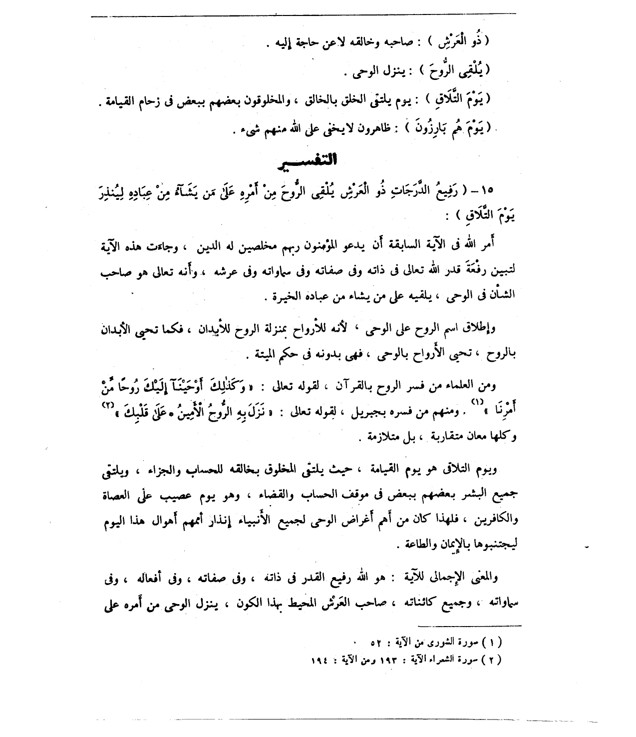 والمعنى الإجمالي للآية: هو الله رفيع القدر في ذاته، وفي صفاته، وفي أفعاله، وفي سماواته، وجميع كائناته، صاحب العرش المحيط بهذا الكون، ينزل الوحى من أمره على