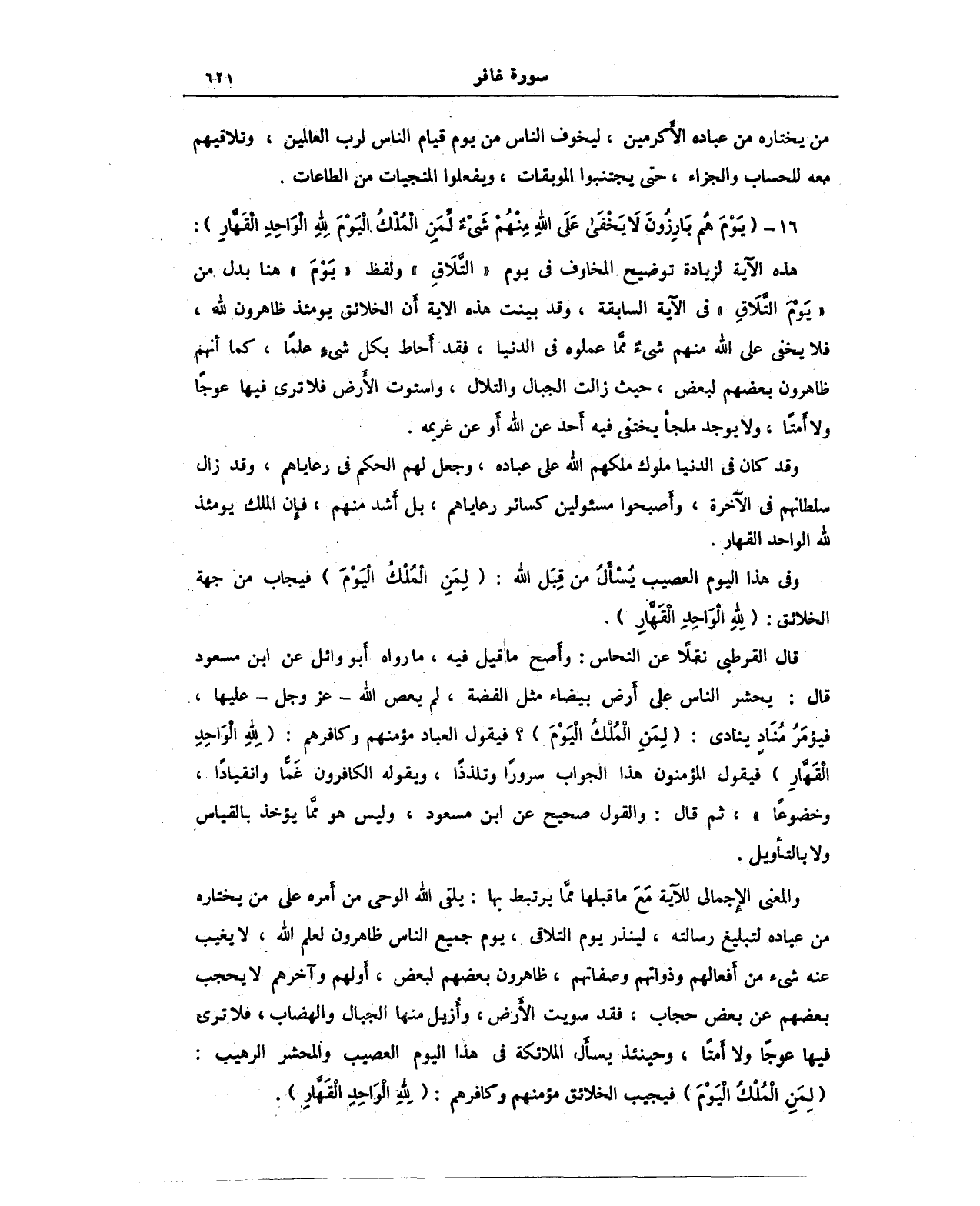 16 - {يَوْمَ هُمْ بَارِزُونَ لَا يَخْفَى عَلَى اللَّهِ مِنْهُمْ شَيْءٌ لِمَنِ الْمُلْكُ الْيَوْمَ لِلَّهِ الْوَاحِدِ الْقَهَّارِ}: