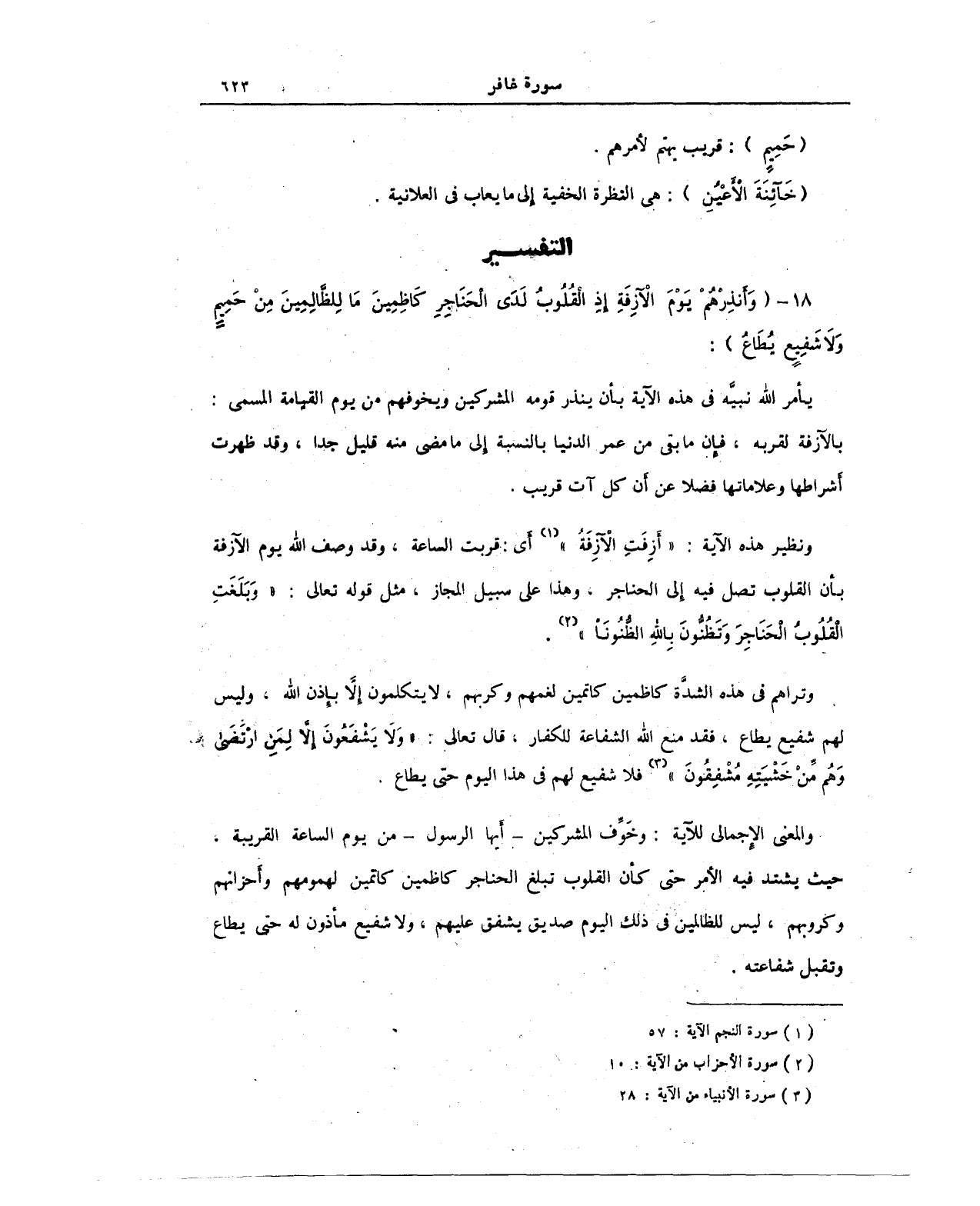 18 - {وَأَنْذِرْهُمْ يَوْمَ الْآزِفَةِ إِذِ الْقُلُوبُ لَدَى الْحَنَاجِرِ كَاظِمِينَ مَا لِلظَّالِمِينَ مِنْ حَمِيمٍ وَلَا شَفِيعٍ يُطَاعُ}):
