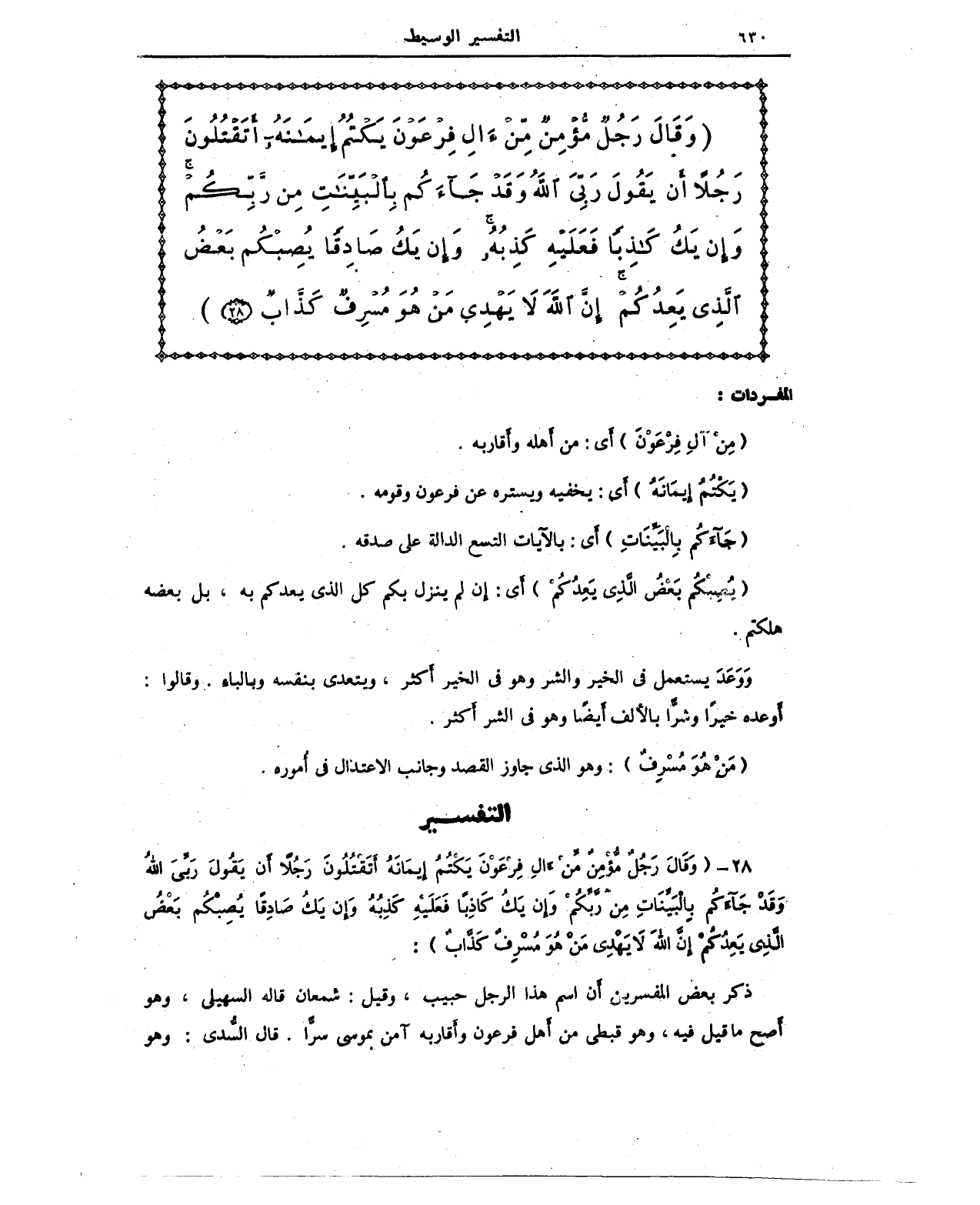 {وَقَالَ رَجُلٌ مُؤْمِنٌ مِنْ آلِ فِرْعَوْنَ يَكْتُمُ إِيمَانَهُ أَتَقْتُلُونَ رَجُلًا أَنْ يَقُولَ رَبِّيَ اللَّهُ وَقَدْ جَاءَكُمْ بِالْبَيِّنَاتِ مِنْ رَبِّكُمْ وَإِنْ يَكُ كَاذِبًا فَعَلَيْهِ كَذِبُهُ وَإِنْ يَكُ صَادِقًا يُصِبْكُمْ بَعْضُ الَّذِي يَعِدُكُمْ إِنَّ اللَّهَ لَا يَهْدِي مَنْ هُوَ مُسْرِفٌ كَذَّابٌ (28)}