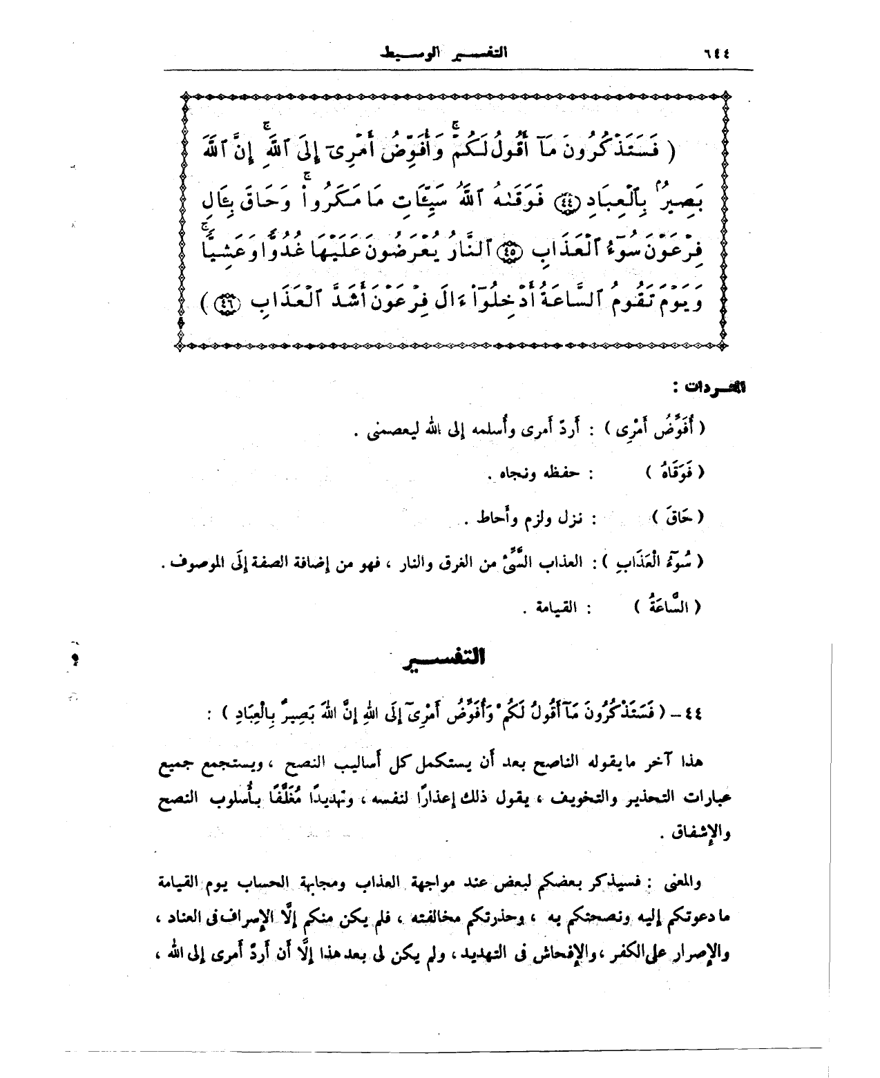 {فَسَتَذْكُرُونَ مَا أَقُولُ لَكُمْ وَأُفَوِّضُ أَمْرِي إِلَى اللَّهِ إِنَّ اللَّهَ بَصِيرٌ بِالْعِبَادِ (44) فَوَقَاهُ اللَّهُ سَيِّئَاتِ مَا مَكَرُوا وَحَاقَ بِآلِ فِرْعَوْنَ سُوءُ الْعَذَابِ (45) النَّارُ يُعْرَضُونَ عَلَيْهَا غُدُوًّا وَعَشِيًّا وَيَوْمَ تَقُومُ السَّاعَةُ أَدْخِلُوا آلَ فِرْعَوْنَ أَشَدَّ الْعَذَابِ (46)}