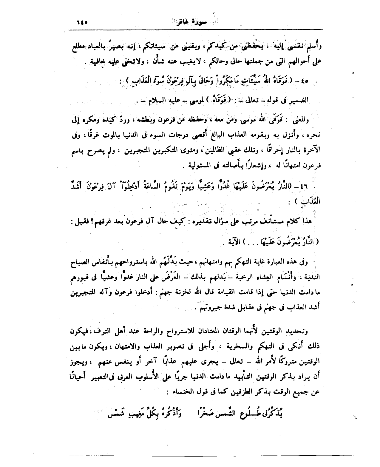46 - {النَّارُ يُعْرَضُونَ عَلَيْهَا غُدُوًّا وَعَشِيًّا وَيَوْمَ تَقُومُ السَّاعَةُ أَدْخِلُوا آلَ فِرْعَوْنَ أَشَدَّ الْعَذَابِ}: