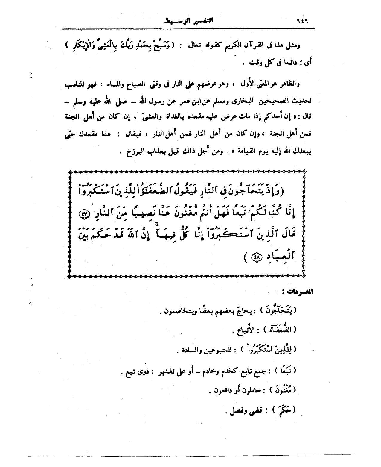 {وَإِذْ يَتَحَاجُّونَ فِي النَّارِ فَيَقُولُ الضُّعَفَاءُ لِلَّذِينَ اسْتَكْبَرُوا إِنَّا كُنَّا لَكُمْ تَبَعًا فَهَلْ أَنْتُمْ مُغْنُونَ عَنَّا نَصِيبًا مِنَ النَّارِ (47) قَالَ الَّذِينَ اسْتَكْبَرُوا إِنَّا كُلٌّ فِيهَا إِنَّ اللَّهَ قَدْ حَكَمَ بَيْنَ الْعِبَادِ (48)}