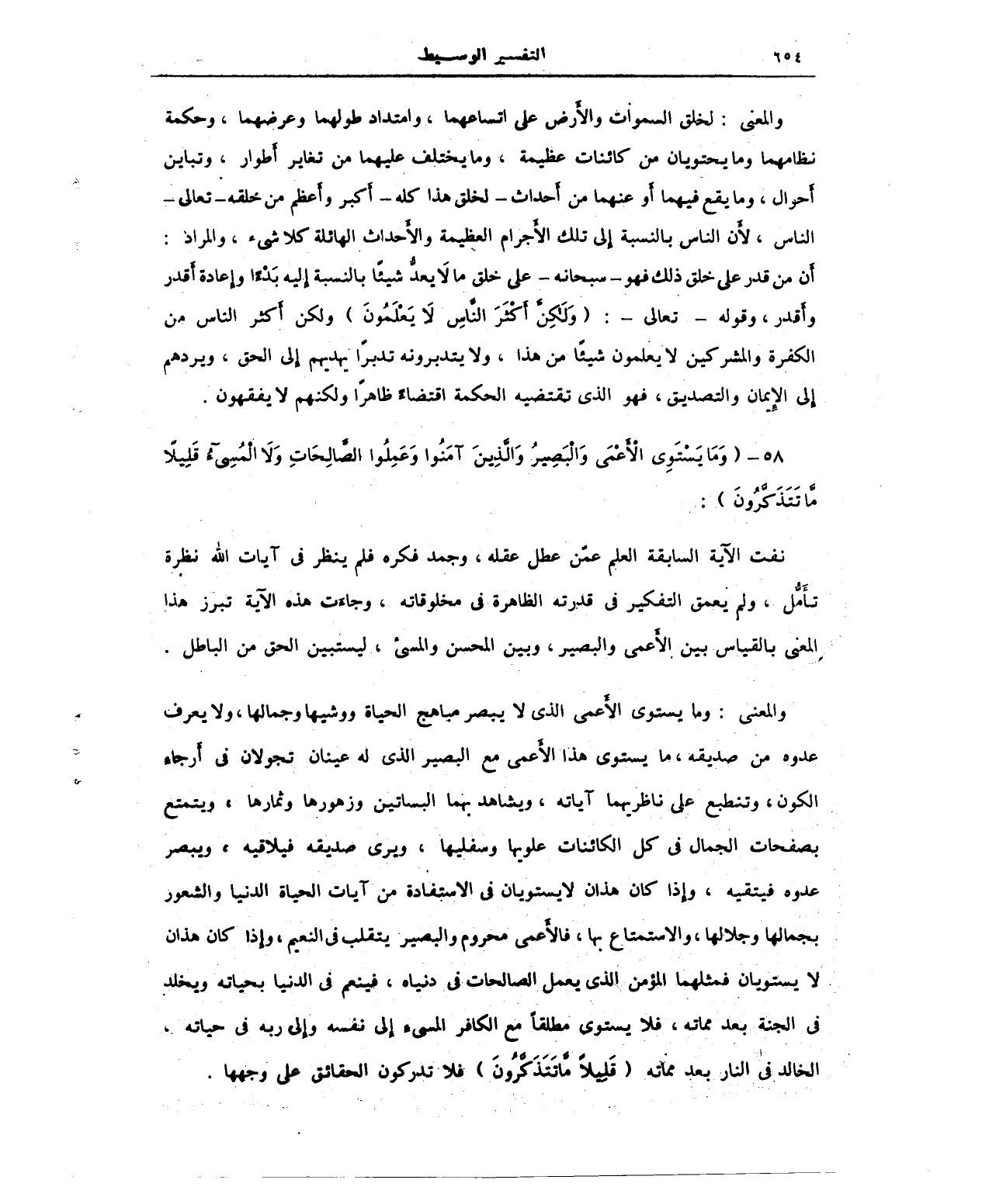 والمعنى: وما يستوى الأعمى الذي لا يبصر مباهج الحياة ووشيها وجمالها, ولا يعرف عدوه من صديقه، ما يستوى هذا الأعمى مع البصير الذي له عينان تجولان في أرجاء الكون، وتنطبع على ناظريهما آياته، ويشاهد بهما البساتين وزهورها وثمارها، ويتمتع بصفحات الجمال في كل الكائنات علويها وسفليها، ويرى صديقه فيلاقيه, ويبصر عدوه فيتقيه، وإذا كان هذان لا يستويان في الاستفادة من آيات الحياة الدنيا والشعور بجمالها وجلالها، والاستمتاع بها، فالأعمى محروم والبصير يتقلب في النعيم، وإذا كان هذان لا يستويان فمثلهما المؤمن الذي يعمل الصالحات في دنياه، فينعم في الدنيا بحياته ويخلد في الجنة بعد مماته، فلا يستوى مطلقًا مع الكافر المسىء إلى نفسه وإلي ربه في حياته، الخالد في النار بعد مماته {قَلِيلًا مَا تَتَذَكَّرُونَ} فلا تدركون الحقائق على وجهها.