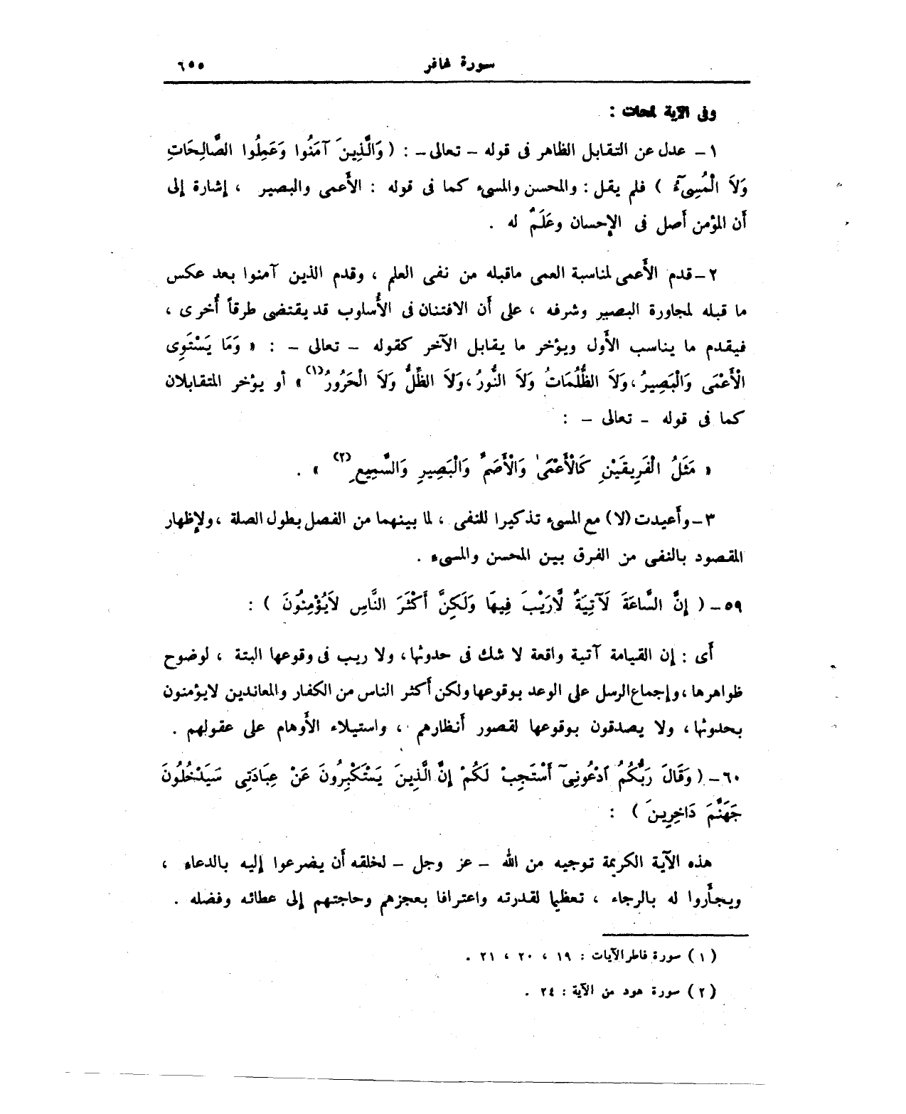 2 - قدم الأعمى لمناسبة العمى ما قبله من نفى العلم، وقدم الذين آمنوا بعد عكس ما قبله لمجاورة البصير وشرفه، على أن الافتنان في الأسلوب قد يقتضي طرقًا أخرى، فيقدم ما يناسب الأول ويؤخر ما يقابل الآخر كقوله - تعالى -: {وَمَا يَسْتَوِي الْأَعْمَى وَالْبَصِيرُ (19) وَلَا الظُّلُمَاتُ وَلَا النُّورُ (20) وَلَا الظِّلُّ وَلَا الْحَرُورُ} (¬1) أو يؤخر المتقابلان كما في قوله - تعالى -: