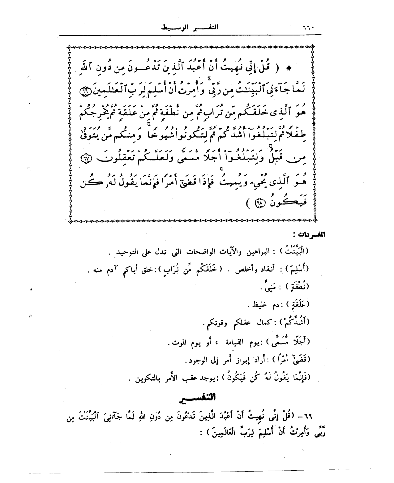 * {قُلْ إِنِّي نُهِيتُ أَنْ أَعْبُدَ الَّذِينَ تَدْعُونَ مِنْ دُونِ اللَّهِ لَمَّا جَاءَنِيَ الْبَيِّنَاتُ مِنْ رَبِّي وَأُمِرْتُ أَنْ أُسْلِمَ لِرَبِّ الْعَالَمِينَ (66) هُوَ الَّذِي خَلَقَكُمْ مِنْ تُرَابٍ ثُمَّ مِنْ نُطْفَةٍ ثُمَّ مِنْ عَلَقَةٍ ثُمَّ يُخْرِجُكُمْ طِفْلًا ثُمَّ لِتَبْلُغُوا أَشُدَّكُمْ ثُمَّ لِتَكُونُوا شُيُوخًا وَمِنْكُمْ مَنْ يُتَوَفَّى مِنْ قَبْلُ وَلِتَبْلُغُوا أَجَلًا مُسَمًّى وَلَعَلَّكُمْ تَعْقِلُونَ (67) هُوَ الَّذِي يُحْيِي وَيُمِيتُ فَإِذَا قَضَى أَمْرًا فَإِنَّمَا يَقُولُ لَهُ كُنْ فَيَكُونُ (68)}