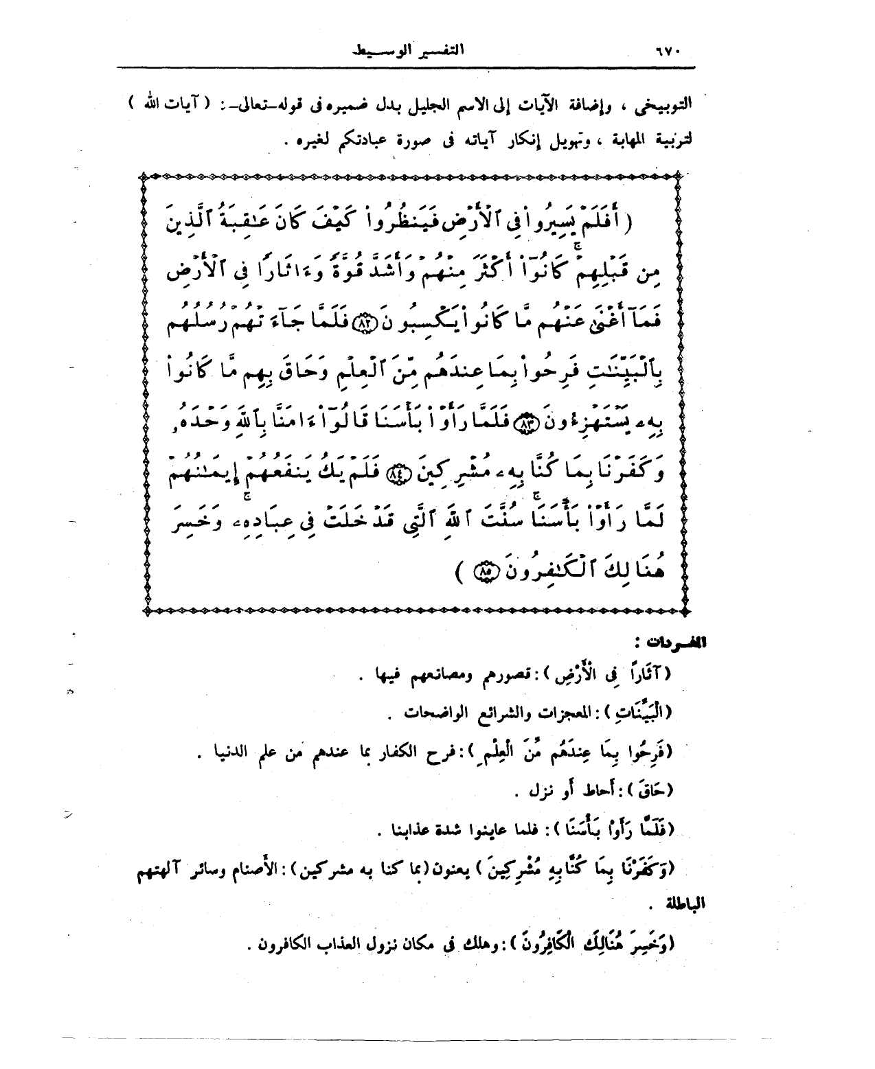 {أَفَلَمْ يَسِيرُوا فِي الْأَرْضِ فَيَنْظُرُوا كَيْفَ كَانَ عَاقِبَةُ الَّذِينَ مِنْ قَبْلِهِمْ كَانُوا أَكْثَرَ مِنْهُمْ وَأَشَدَّ قُوَّةً وَآثَارًا فِي الْأَرْضِ فَمَا أَغْنَى عَنْهُمْ مَا كَانُوا يَكْسِبُونَ (82) فَلَمَّا جَاءَتْهُمْ رُسُلُهُمْ بِالْبَيِّنَاتِ فَرِحُوا بِمَا عِنْدَهُمْ مِنَ الْعِلْمِ وَحَاقَ بِهِمْ مَا كَانُوا بِهِ يَسْتَهْزِئُونَ (83) فَلَمَّا رَأَوْا بَأْسَنَا قَالُوا آمَنَّا بِاللَّهِ وَحْدَهُ وَكَفَرْنَا بِمَا كُنَّا بِهِ مُشْرِكِينَ (84) فَلَمْ يَكُ يَنْفَعُهُمْ إِيمَانُهُمْ لَمَّا رَأَوْا بَأْسَنَا سُنَّتَ اللَّهِ الَّتِي قَدْ خَلَتْ فِي عِبَادِهِ وَخَسِرَ هُنَالِكَ الْكَافِرُونَ (85)} {أَفَلَمْ يَسِيرُوا فِي الْأَرْضِ فَيَنْظُرُوا كَيْفَ كَانَ عَاقِبَةُ الَّذِينَ مِنْ قَبْلِهِمْ كَانُوا أَكْثَرَ مِنْهُمْ وَأَشَدَّ قُوَّةً وَآثَارًا فِي الْأَرْضِ فَمَا أَغْنَى عَنْهُمْ مَا كَانُوا يَكْسِبُونَ (82) فَلَمَّا جَاءَتْهُمْ رُسُلُهُمْ بِالْبَيِّنَاتِ فَرِحُوا بِمَا عِنْدَهُمْ مِنَ الْعِلْمِ وَحَاقَ بِهِمْ مَا كَانُوا بِهِ يَسْتَهْزِئُونَ (83) فَلَمَّا رَأَوْا بَأْسَنَا قَالُوا آمَنَّا بِاللَّهِ وَحْدَهُ وَكَفَرْنَا بِمَا كُنَّا بِهِ مُشْرِكِينَ (84) فَلَمْ يَكُ يَنْفَعُهُمْ إِيمَانُهُمْ لَمَّا رَأَوْا بَأْسَنَا سُنَّتَ اللَّهِ الَّتِي قَدْ خَلَتْ فِي عِبَادِهِ وَخَسِرَ هُنَالِكَ الْكَافِرُونَ (85)}