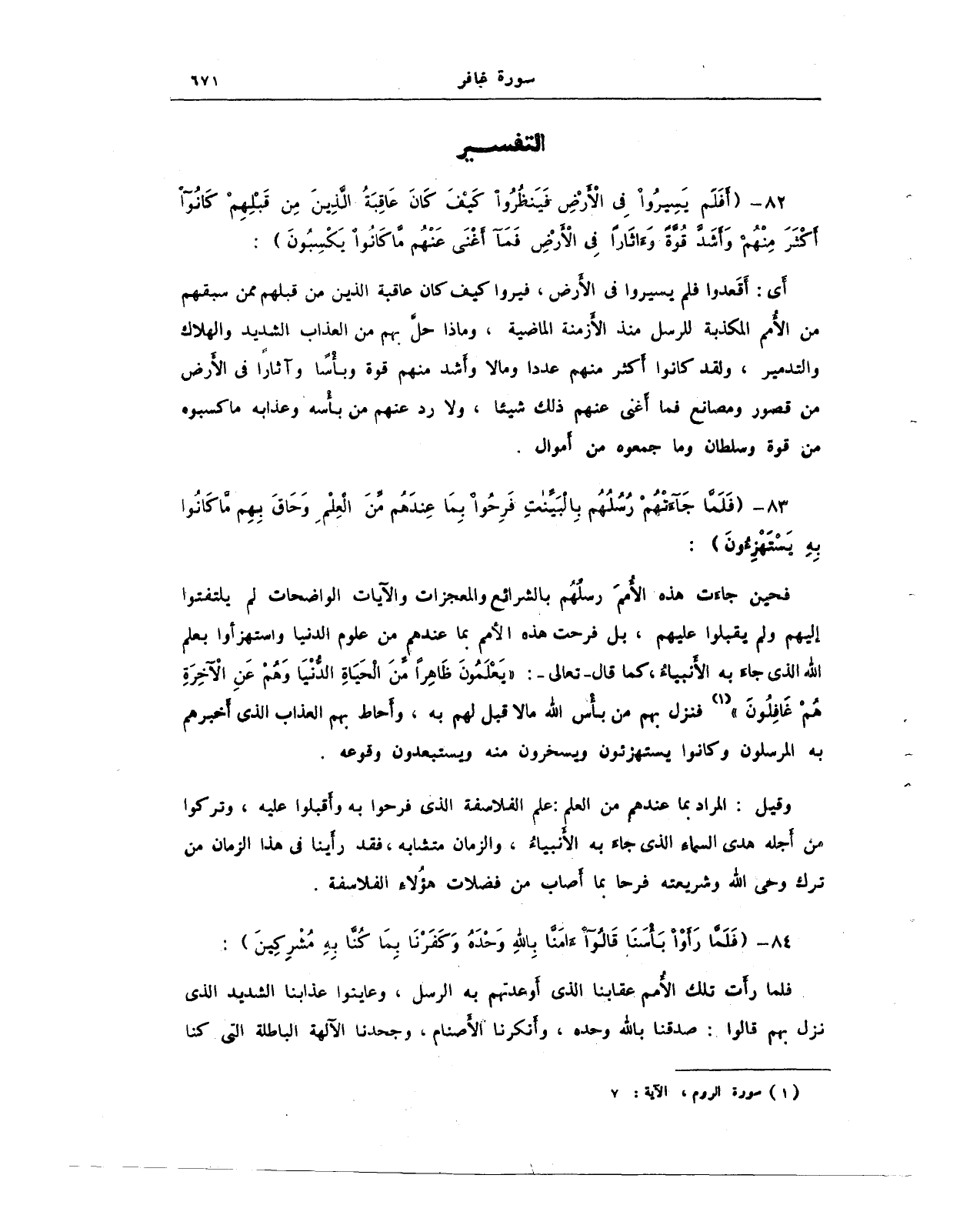 82 - {أَفَلَمْ يَسِيرُوا فِي الْأَرْضِ فَيَنْظُرُوا كَيْفَ كَانَ عَاقِبَةُ الَّذِينَ مِنْ قَبْلِهِمْ كَانُوا أَكْثَرَ مِنْهُمْ وَأَشَدَّ قُوَّةً وَآثَارًا فِي الْأَرْضِ فَمَا أَغْنَى عَنْهُمْ مَا كَانُوا يَكْسِبُونَ}:
