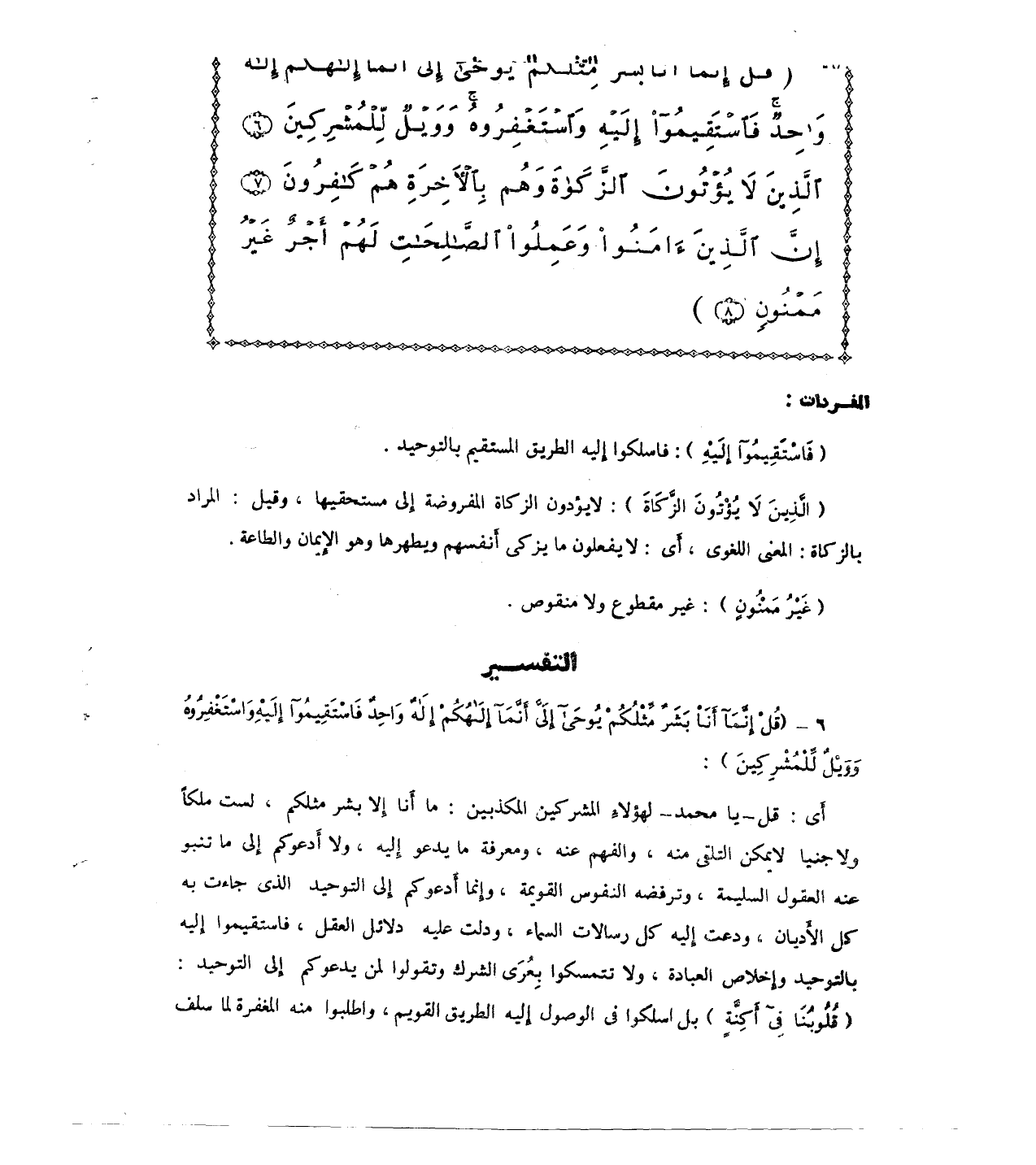 {قُلْ إِنَّمَا أَنَا بَشَرٌ مِثْلُكُمْ يُوحَى إِلَيَّ أَنَّمَا إِلَهُكُمْ إِلَهٌ وَاحِدٌ فَاسْتَقِيمُوا إِلَيْهِ وَاسْتَغْفِرُوهُ وَوَيْلٌ لِلْمُشْرِكِينَ (6) الَّذِينَ لَا يُؤْتُونَ الزَّكَاةَ وَهُمْ بِالْآخِرَةِ هُمْ كَافِرُونَ (7) إِنَّ الَّذِينَ آمَنُوا وَعَمِلُوا الصَّالِحَاتِ لَهُمْ أَجْرٌ غَيْرُ مَمْنُونٍ (8)}