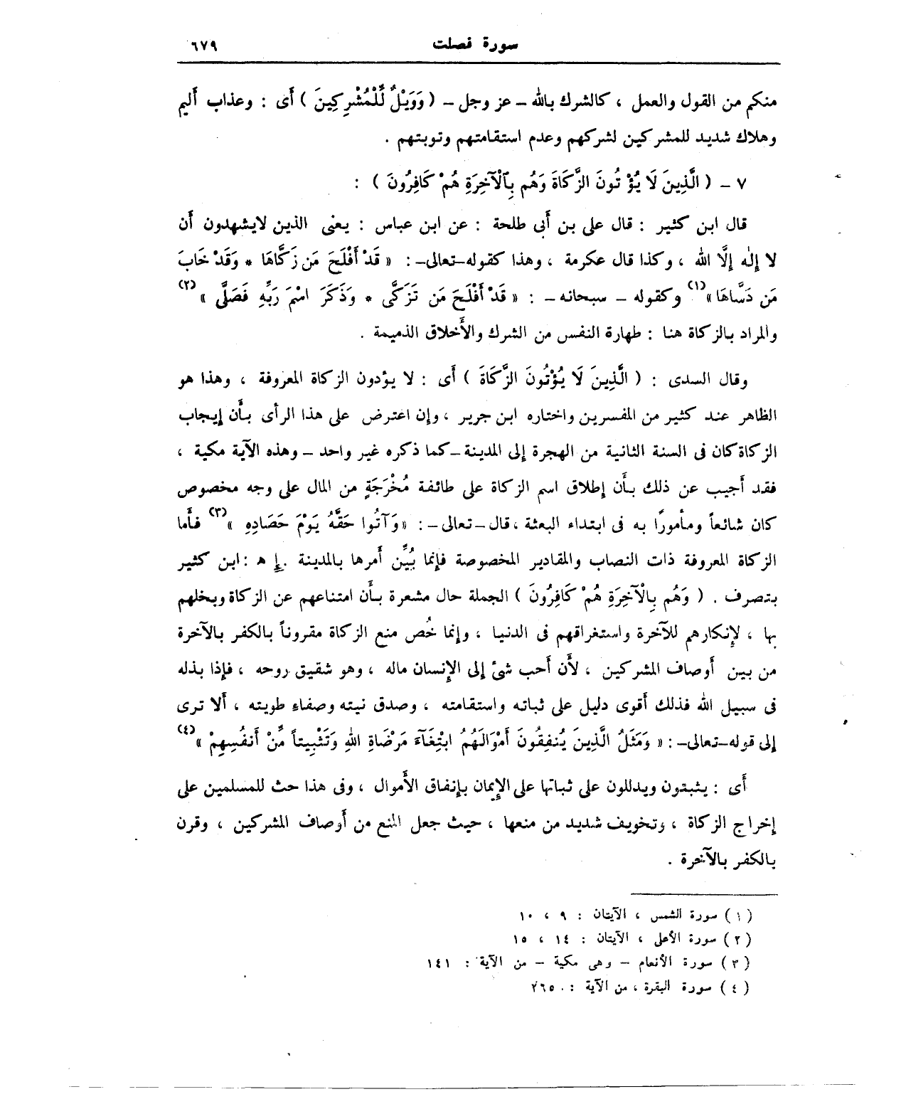 وقال السدى: {الَّذِينَ لَا يُؤْتُونَ الزَّكَاةَ} أَي: لا يؤدون الزكاة المعروفة، وهذا هو الظاهر عند كثير من المفسرين واختاره ابن جرير، وإن اعترض على هذا الرأى بأَن إيجاب الزكاه كان في السنة الثانية من الهجرة إلى المدينة - كما ذكره غير واحد - وهذه الآية مكية، فقد أجيب عن ذلك بأَن إطلاق اسم الزكاة على طائفة مُخْرَجَةٍ من المال على وجه مخصوص كان شائعًا ومأمورًا به في ابتداء البعثة, قال - تعالى -: {وَآتُوا حَقَّهُ يَوْمَ حَصَادِهِ} (¬3) فأَما الزكاة المعروفة ذات النصاب والمقادير المخصوصة فإِنما بُيِّن أمرها بالمدينة. اهـ: ابن كثير بتصرف. {وَهُمْ بِالْآخِرَةِ هُمْ كَافِرُونَ} الجملة حال مشعرة بأَن امتناعهم عن الزكاة وبخلهم بها، لإنكارهم للآخرة واستغراقهم في الدنيا، وإنما خُص منع الزكاة مقرونًا بالكفر بالآخرة من بين أوصاف المشركين، لأن أحب شيء إلى الإنسان ماله، وهو شقيق روحه، فإذا بذله في سبيل الله فذلك أقوى دليل على ثباته واستقامته، وصدق نيته وصفاء طويته، ألا ترى إلى قوله - تعالى -: {وَمَثَلُ الَّذِينَ يُنْفِقُونَ أَمْوَالَهُمُ ابْتِغَاءَ مَرْضَاتِ اللَّهِ وَتَثْبِيتًا مِنْ أَنْفُسِهِمْ} (¬4).