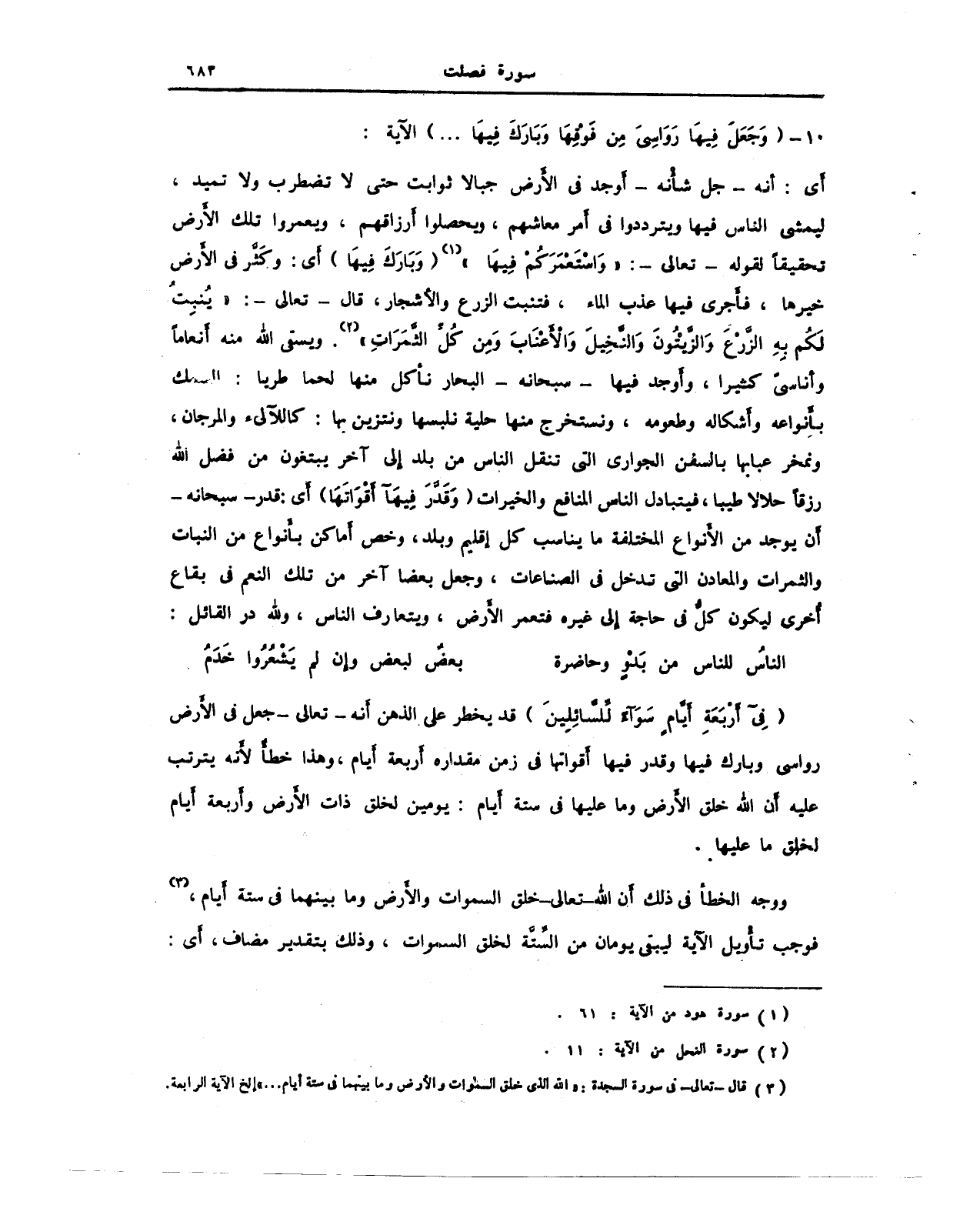 {فِي أَرْبَعَةِ أَيَّامٍ سَوَاءً لِلسَّائِلِينَ} قد يخطر على الذهن أنه - تعالى - جعل في الأرض رواسى وبارك فيها وقدر فيها أقواتها في زمن مقداره أربعة أَيام، وهذا خطأٌ لأَنه يترتب عليه أَن الله خلق الأرض وما عليها في ستة أيام: يومين لخلق ذات الأرض وأَربعة أَيام لخلق ما عليها.