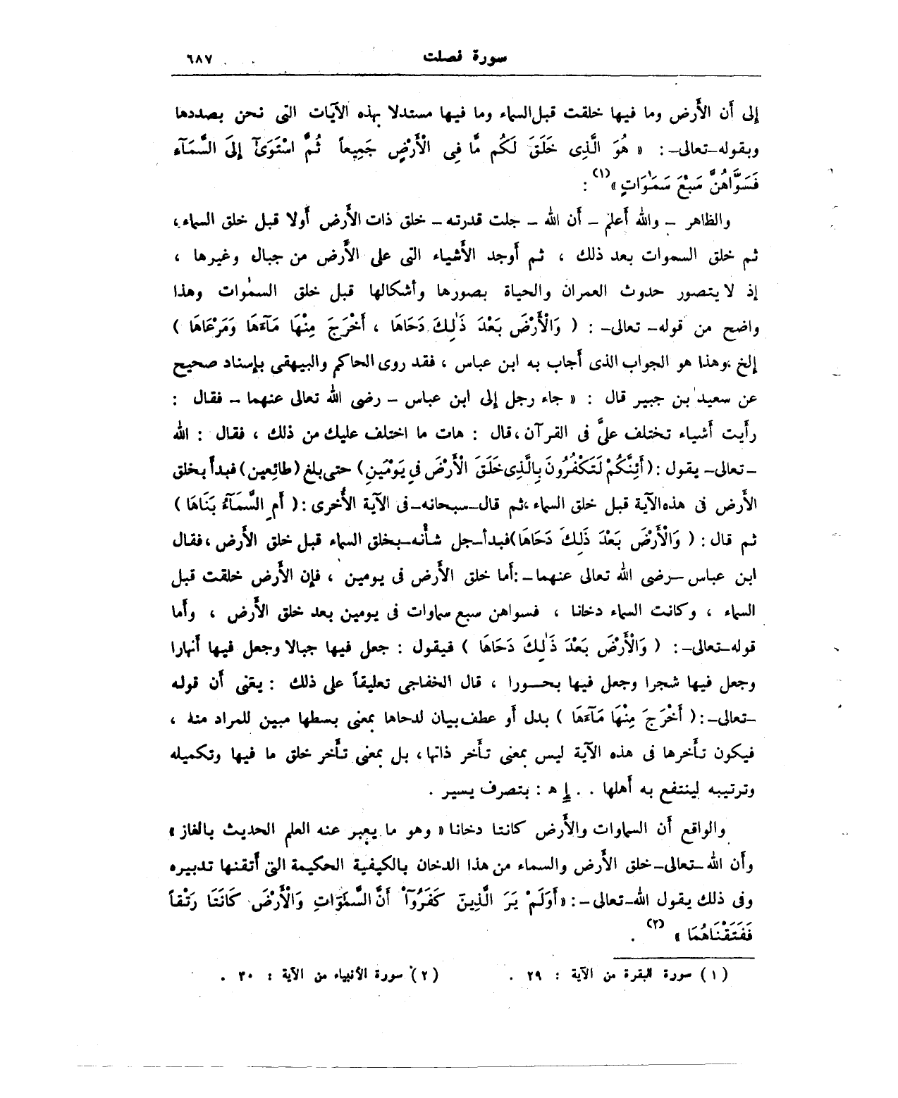والظاهر - والله أعلم - أَن الله - جلت قدرته - خاق ذات الأَرض أولًا قبل خلق السماء، ثم خلق السموات بعد ذلك، ثم أوجد الأشياء التي على الأَرض من جبال وغيرها، إذ لا يتصور حدوث العمران والحياة بصورها وأشكالها قبل خلق السموات وهذا واضح من قوله - تعالى -: {وَالْأَرْضَ بَعْدَ ذَلِكَ دَحَاهَا (30) أَخْرَجَ مِنْهَا مَاءَهَا وَمَرْعَاهَا (31)} إلخ, وهذا هو الجواب الذي أجاب به ابن عباس، فقد روى الحاكم والبيهقي بإسناد صحيح عن سعيد ابن جبير قال: "جاء رجل إلى ابن عباس - رضي الله تعالى عنهما - فقال: رأيت أَشياء تختلف علي في القرآن، قال: هات ما اختلف عليك من ذلك، فقال: الله - تعالى - يقول: {أَئِنَّكُمْ لَتَكْفُرُونَ بِالَّذِي خَلَقَ الْأَرْضَ فِي يَوْمَيْنِ} حتى بلغ {طَائِعِينَ} فبدأ بخلق الأَرض في هذه الآية قبل خلق السماء، ثم قال - سبحانه - في الآية الأُخرى: {أَمِ السَّمَاءُ بَنَاهَا} ثم قال: {وَالْأَرْضَ بَعْدَ ذَلِكَ دَحَاهَا} فبدأ - جل شأْنه - بخلق السماء قبل خلق الأَرض، فقال ابن عباس - رضي الله تعالى عنهما -: أما خلق الأَرض في يومين، فإن الأَرض خلقت قبل السماء، وكانت السماء دخانا، فسواهن سبع سماوات في يومين بعد خلق الأَرض، وأما قوله - تعالى -: {وَالْأَرْضَ بَعْدَ ذَلِكَ دَحَاهَا} فيقول: جعل فيها جبالا وجعل فيها أنهارا وجعل فيها شجرا وجعل فيها بحورا، قال الخفاجى تعليقًا على ذلك: يعنى أَن قوله - تعالى -: {أَخْرَجَ مِنْهَا مَاءَهَا} بدل أو عطف بيان لدحاها بمعنى بسطها مبين للمراد منه، فيكون تأَخرها في هذه الآية ليس بمعنى تأَخر ذاتها، بل بمعنى تأَخر خلق ما فيها وتكميله وترتيبه لينتفع به أهلها .. اهـ: بتصرف يسير.